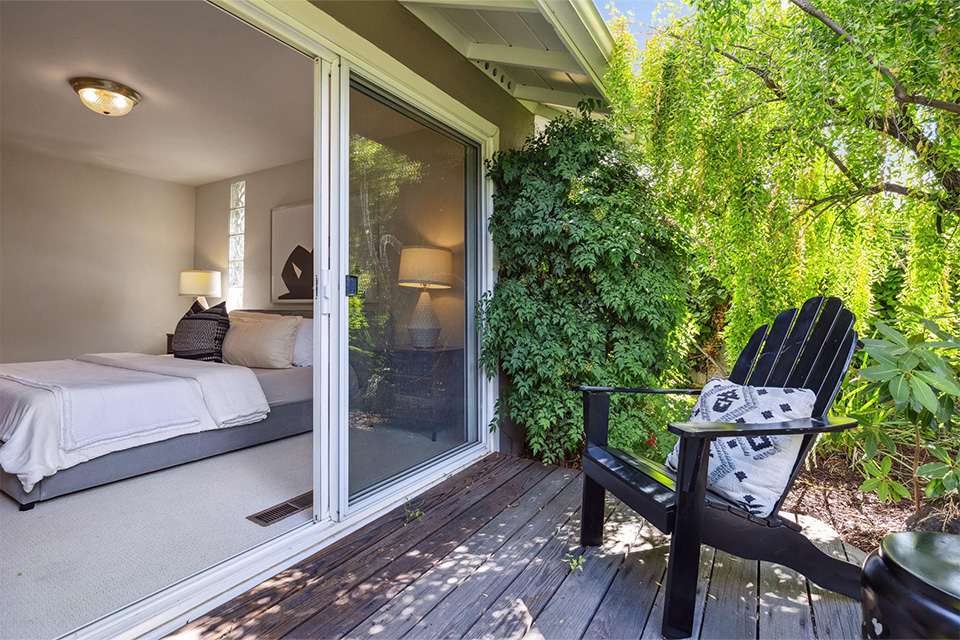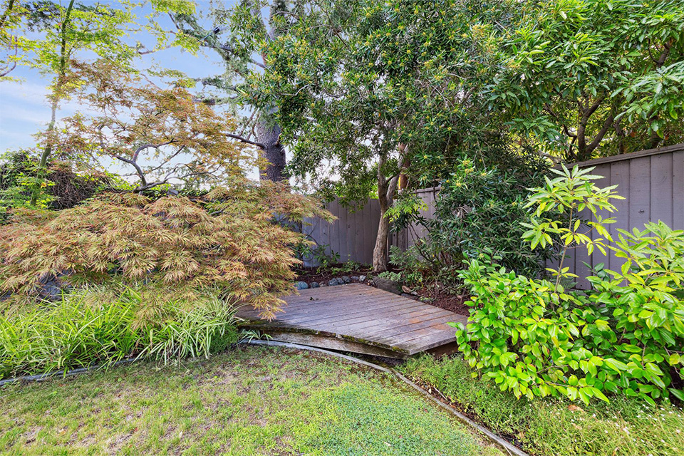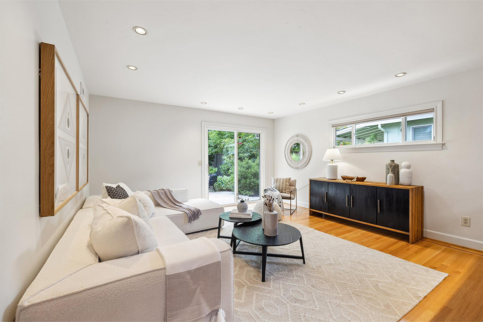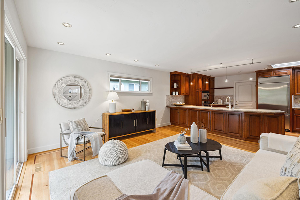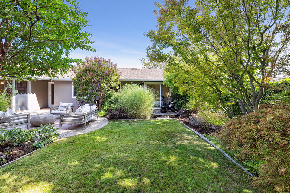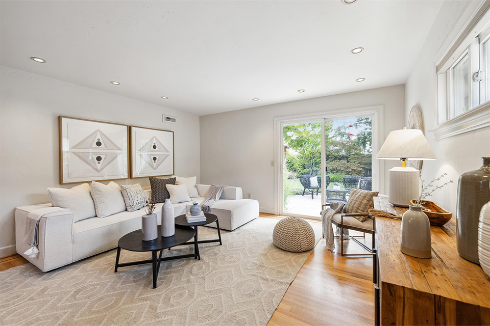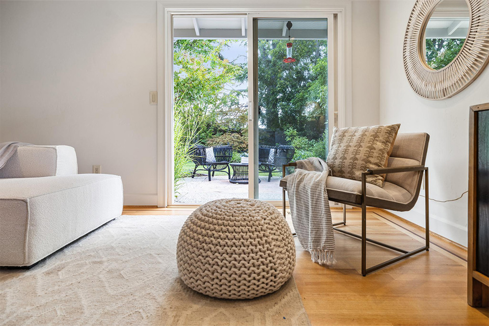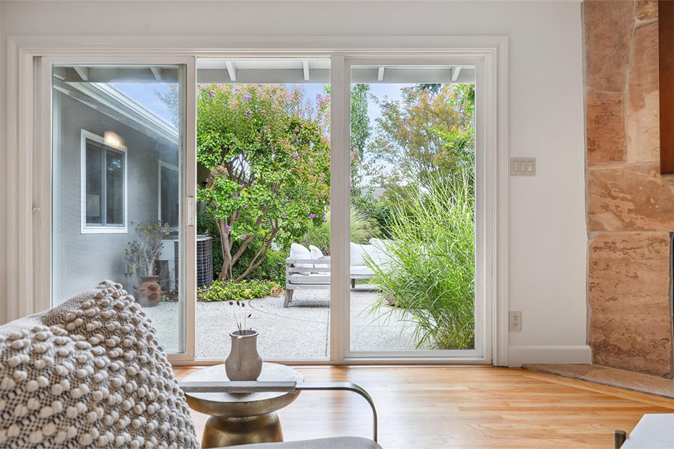- Sliding glass doors in the living room and family room leading out to the lush rear garden