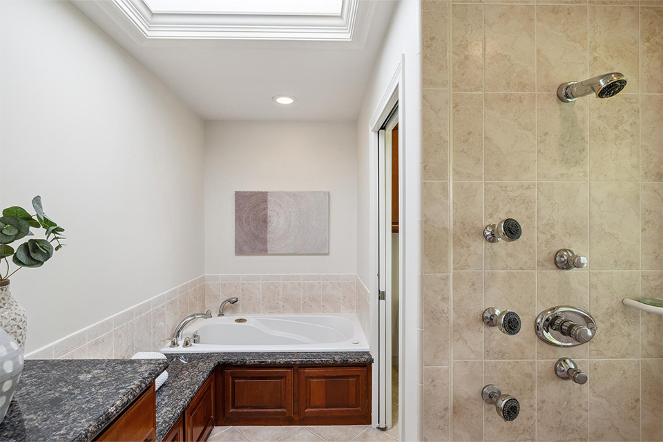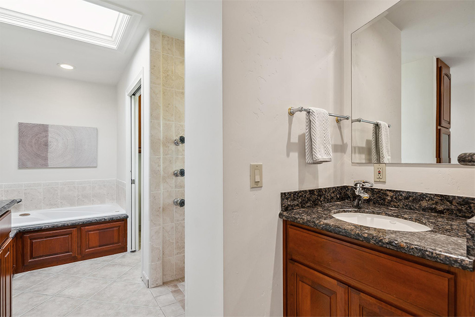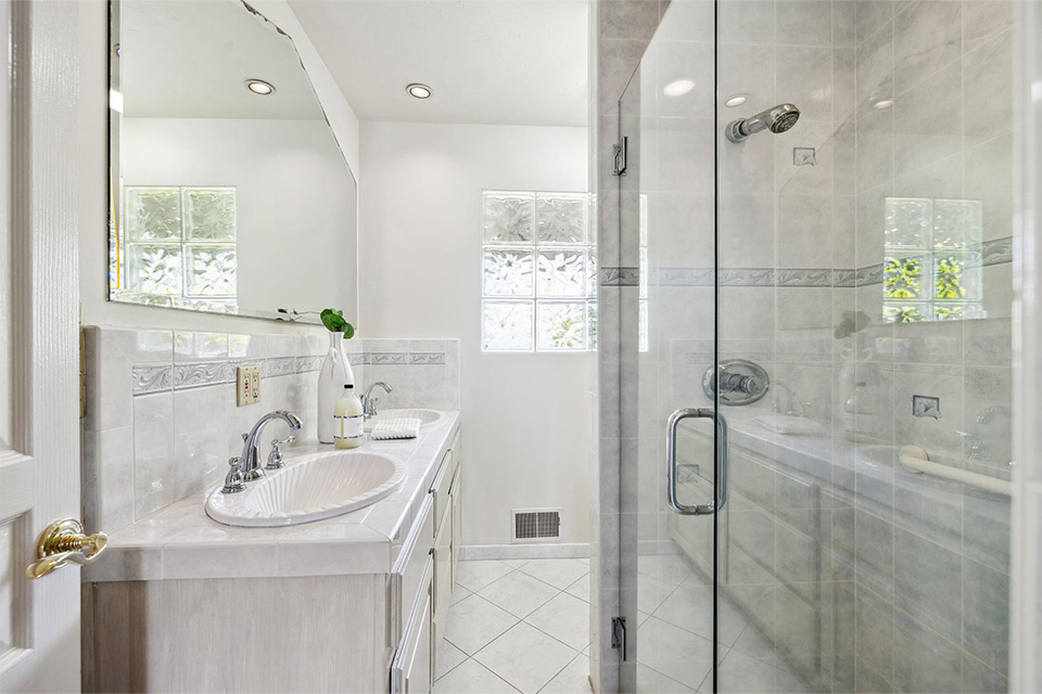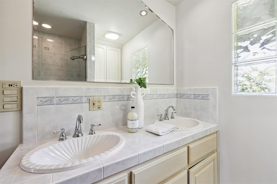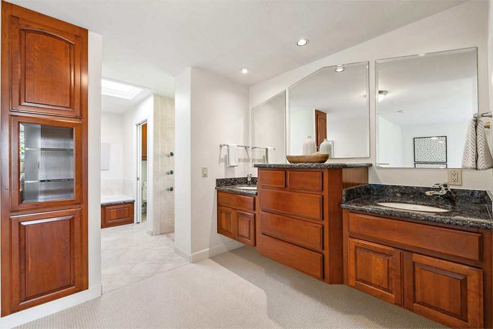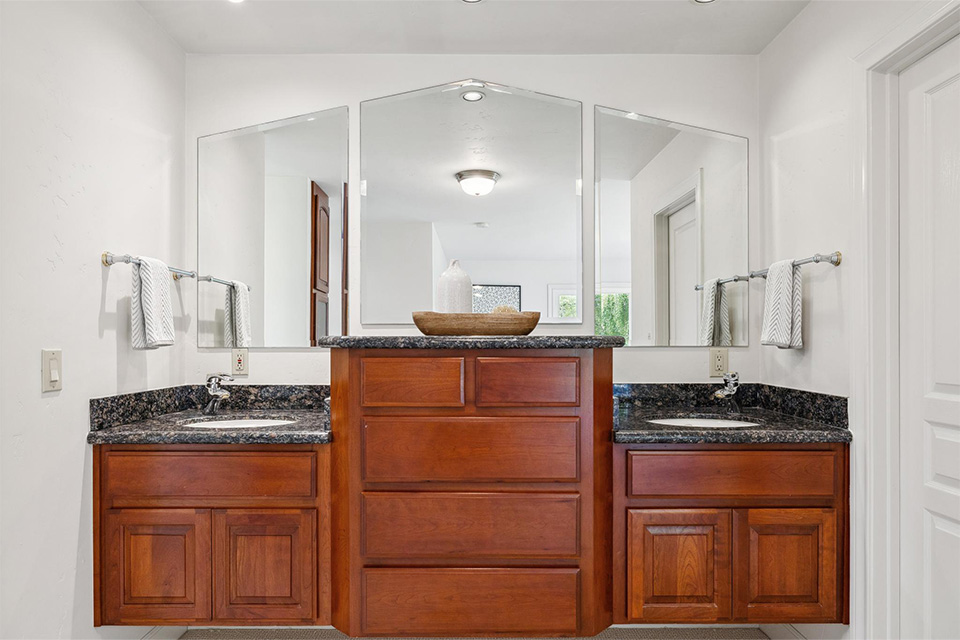 - Three additional bedrooms and a hall bathroom with dual sinks and a walk-in shower
