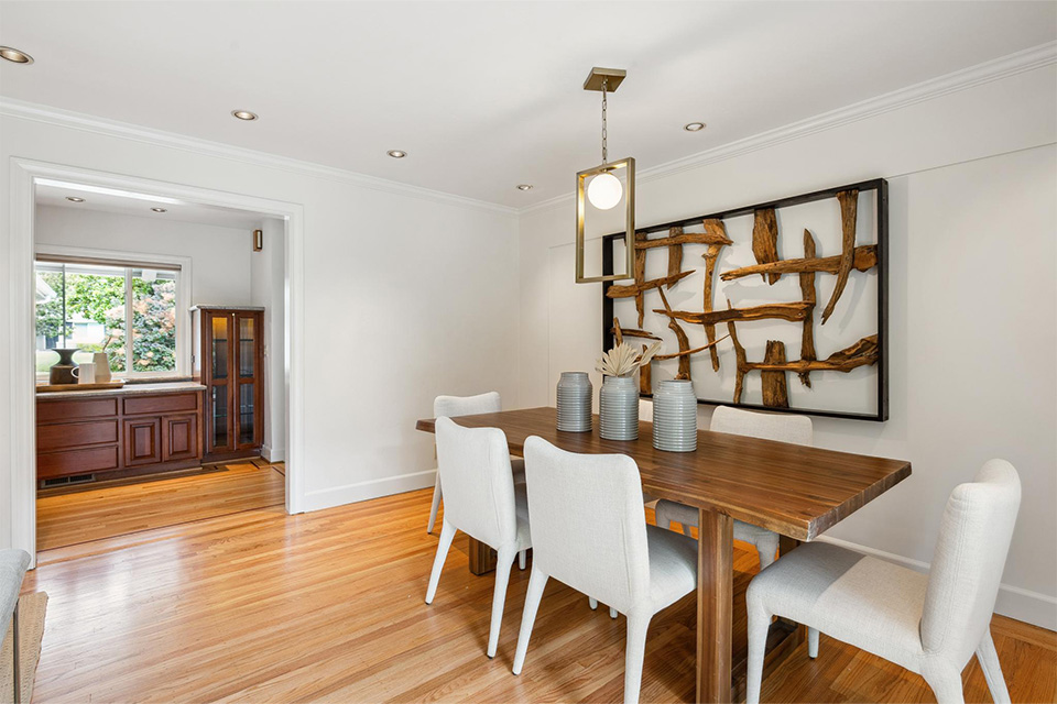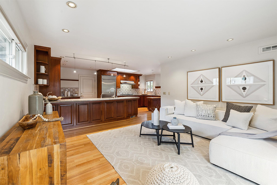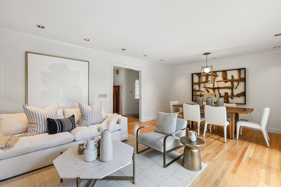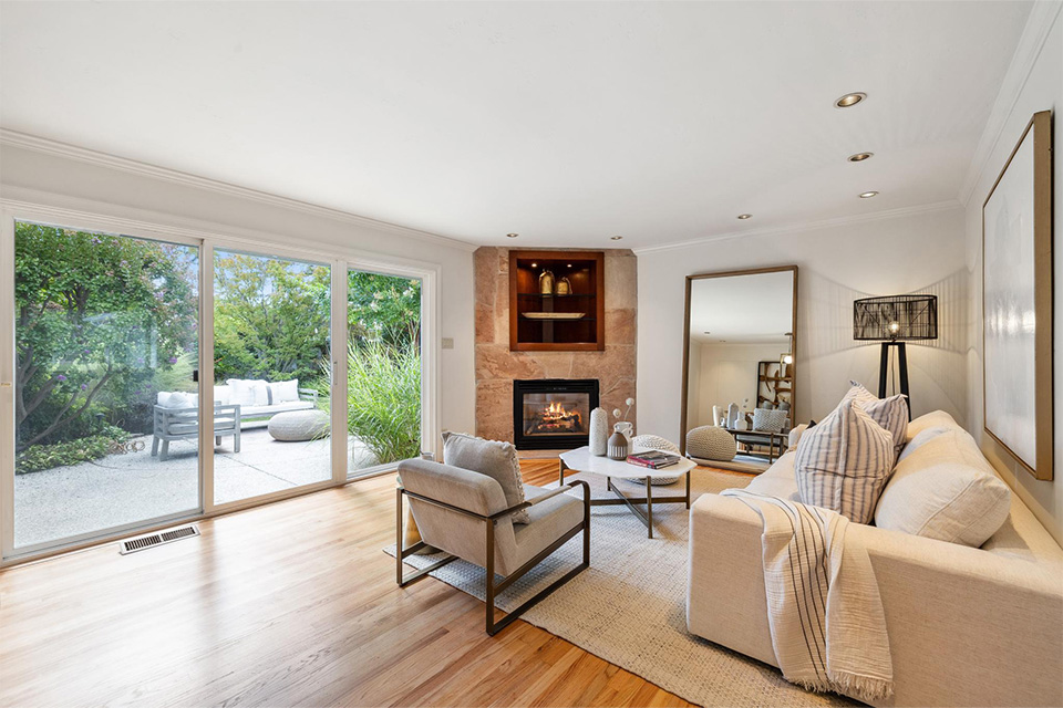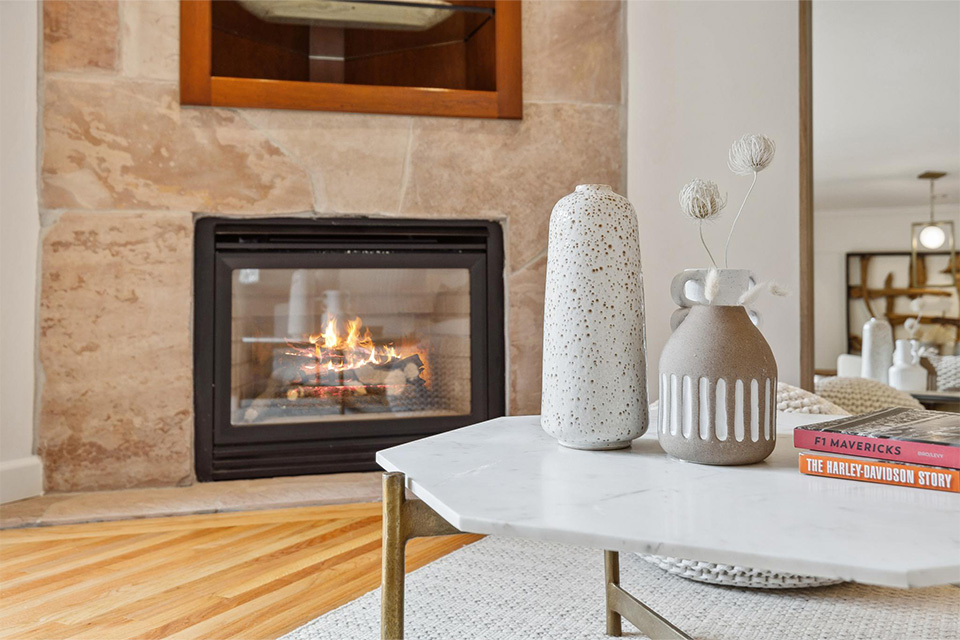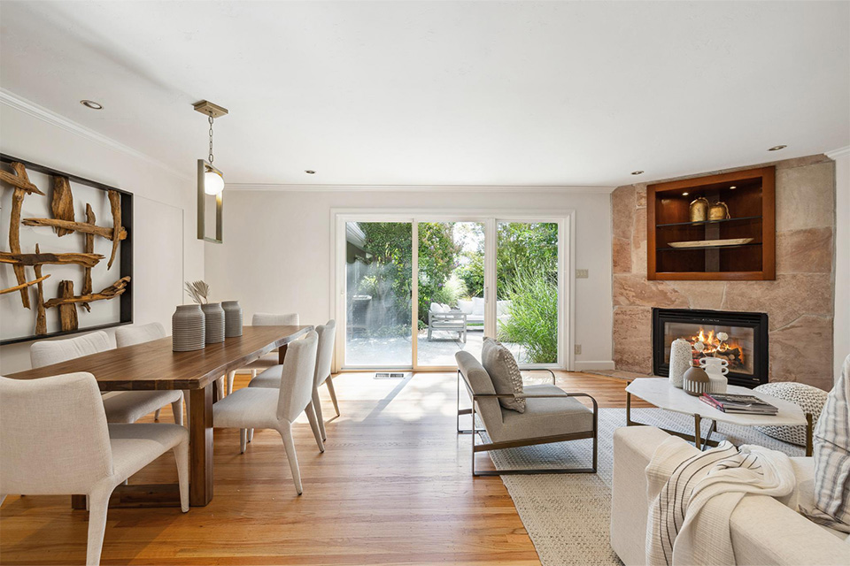 - Bright living room with adjacent dining area and corner gas fireplace