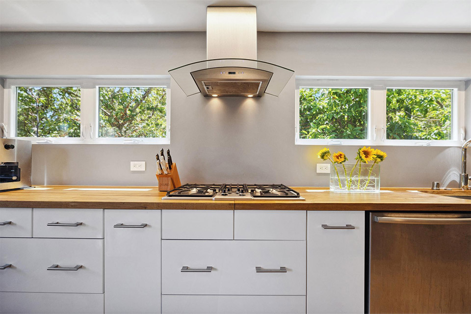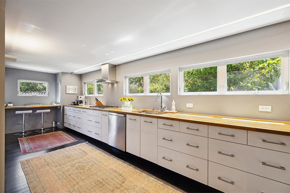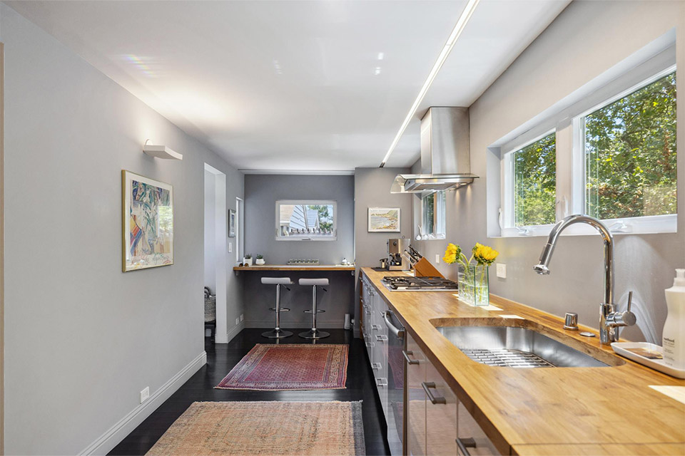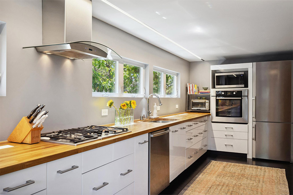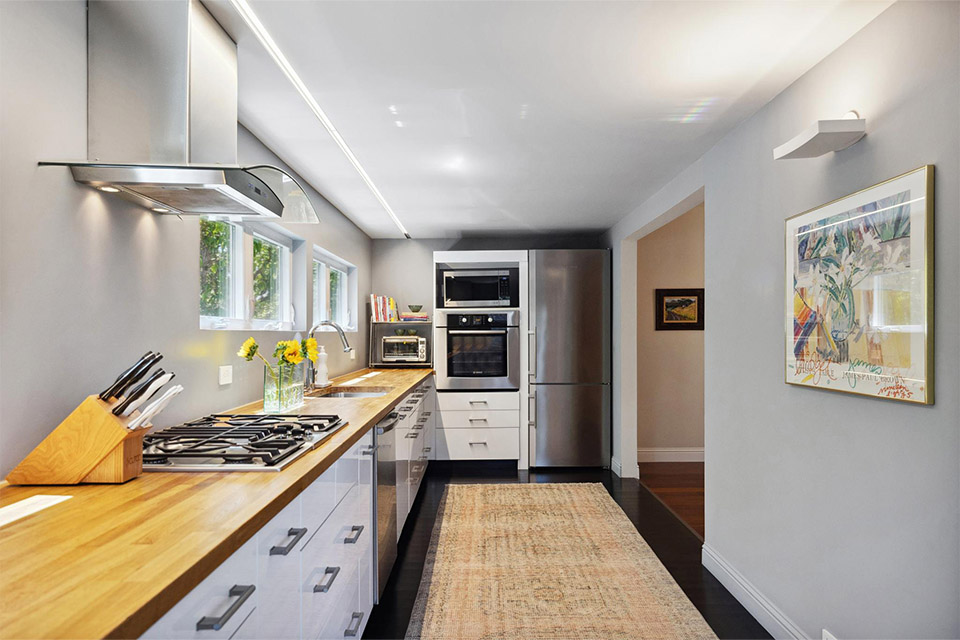 - Custom kitchen with butcher block countertops and high-end stainless steel appliances