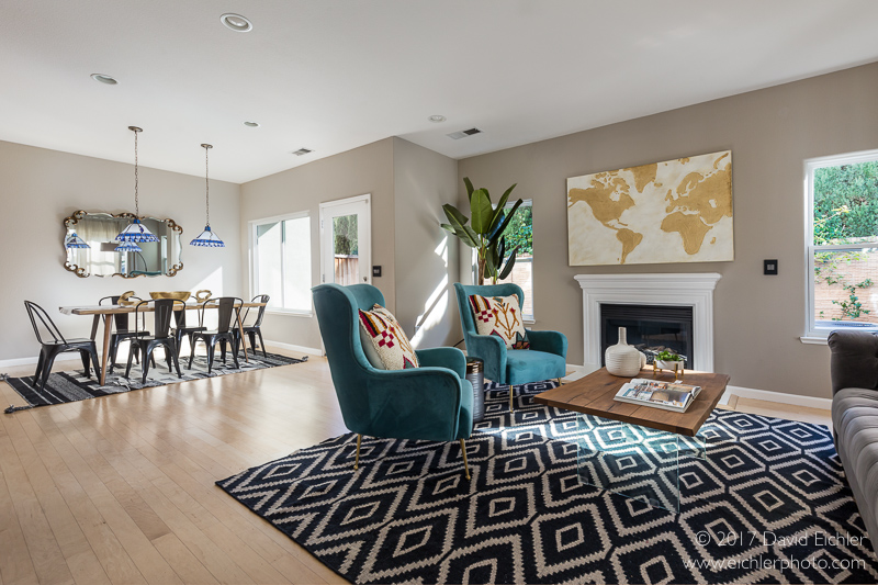 Bright and welcoming living area complete with hardwood floors, panel windows, a cozy fireplace, and surround sound.