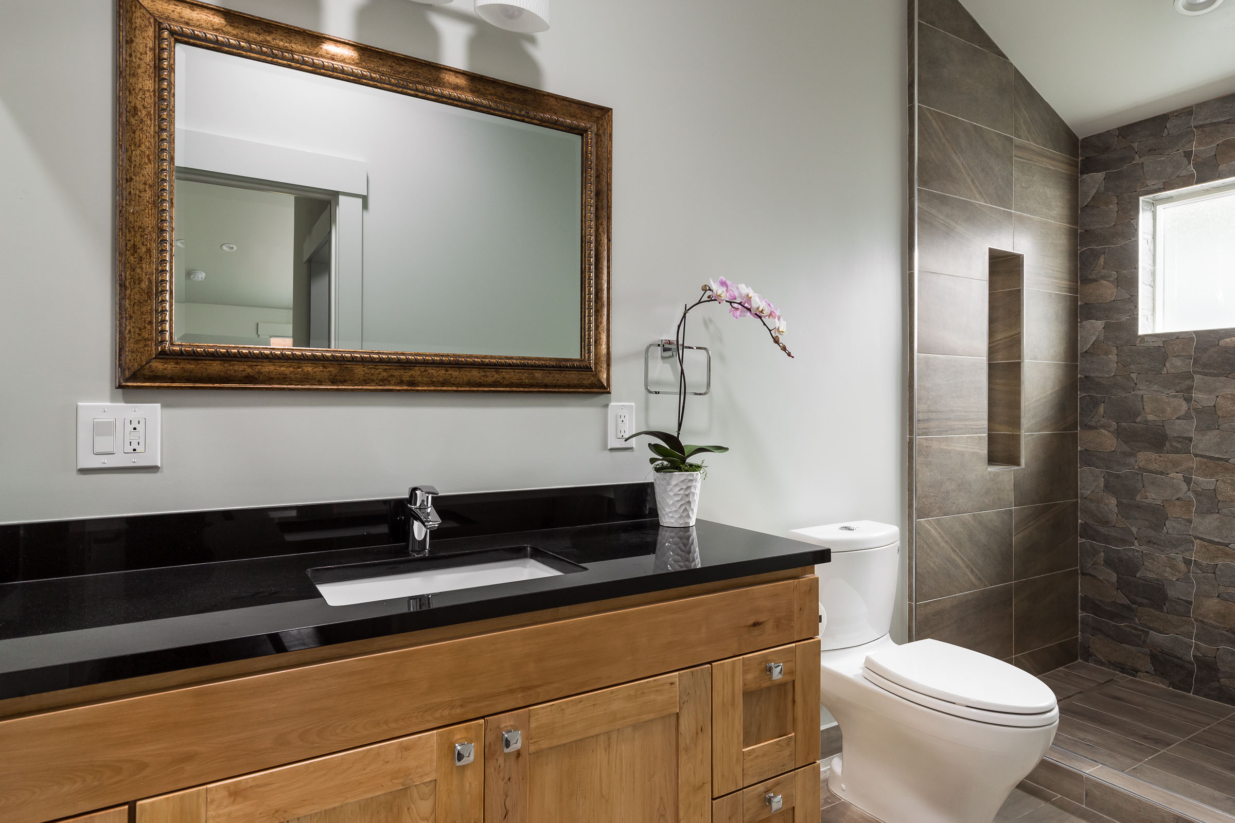Generous master bedroom ensuite with walk-in shower and spacious closet overlooks the beautiful backyard.