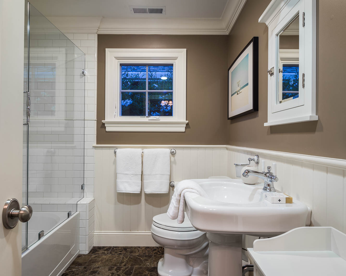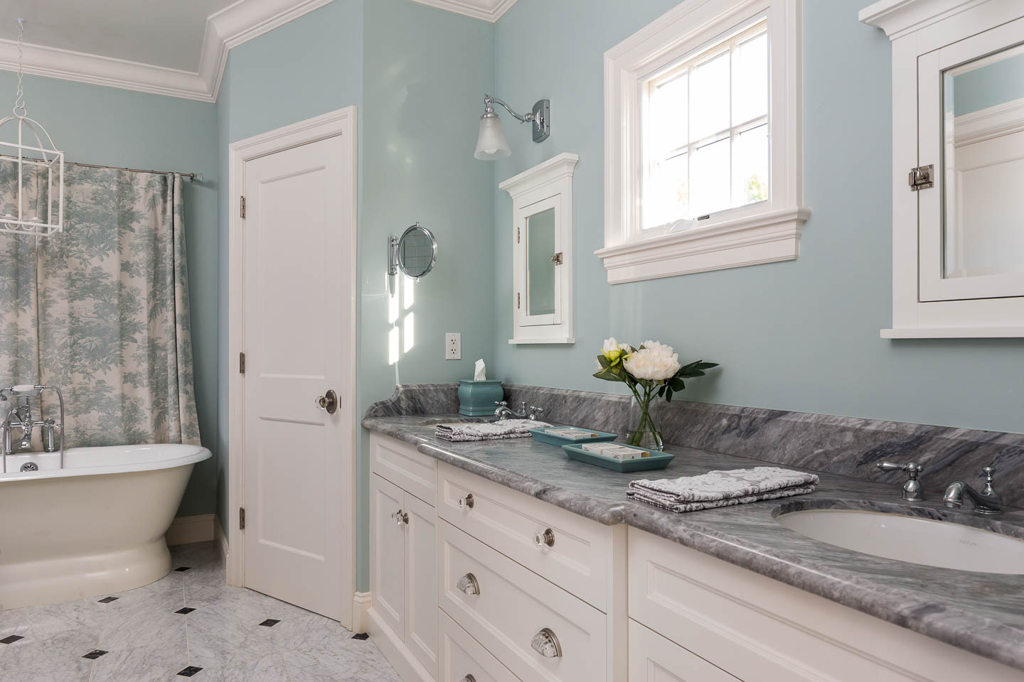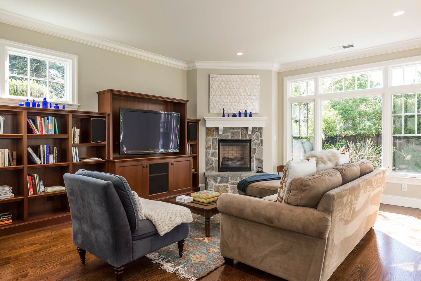 Escape upstairs to this wonderful oasis with tree top views, a balcony, cozy fireplace and luxurious spa-like bathroom with stand-alone tub, walk- in shower and dual sinks.