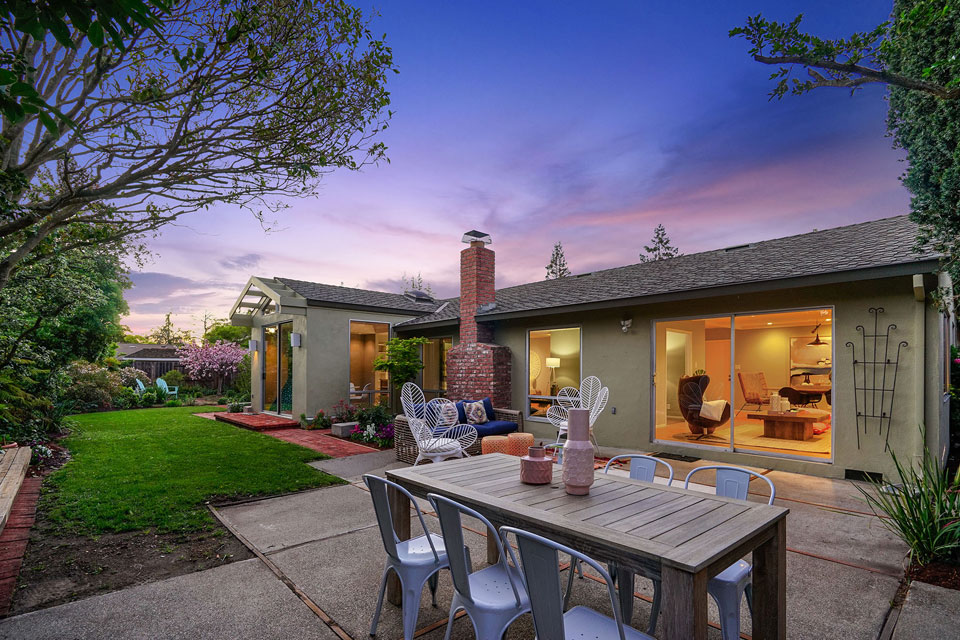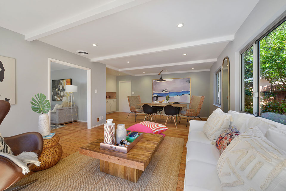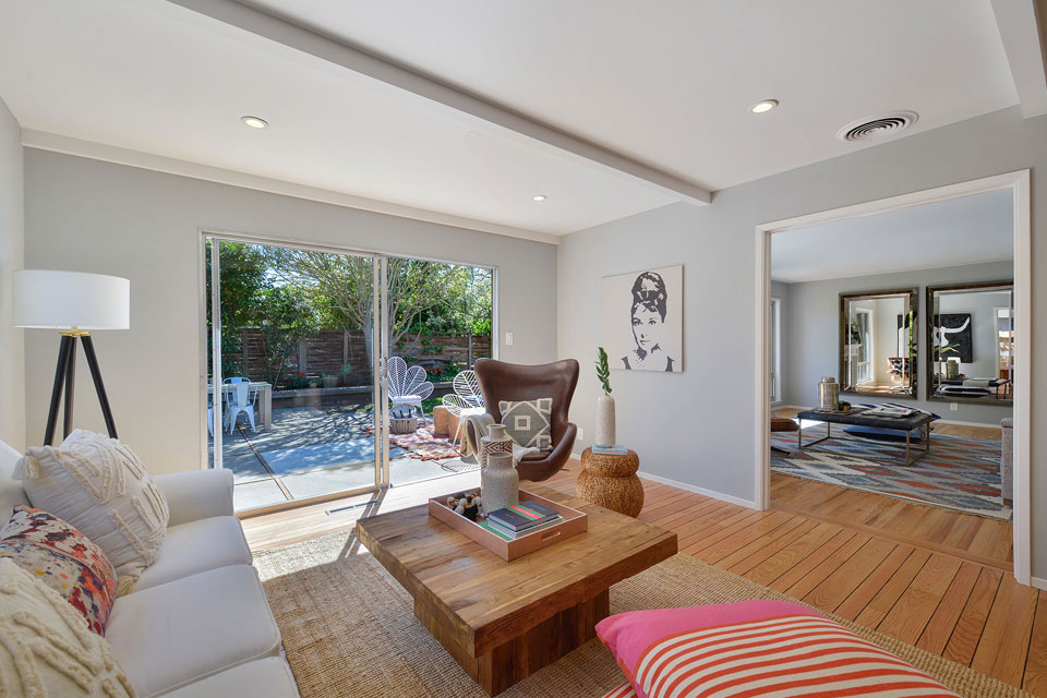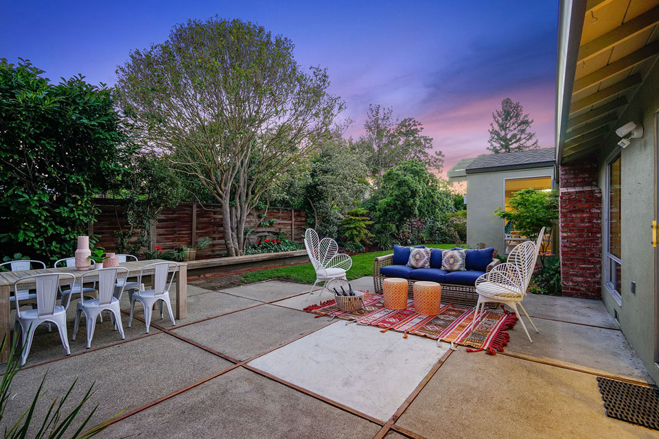 A well appointed family room connects to the dining area and seamlessly flows out to the large patio and lush garden.