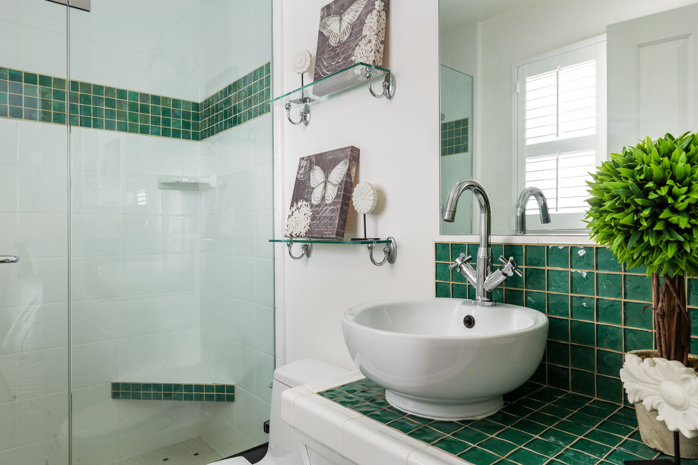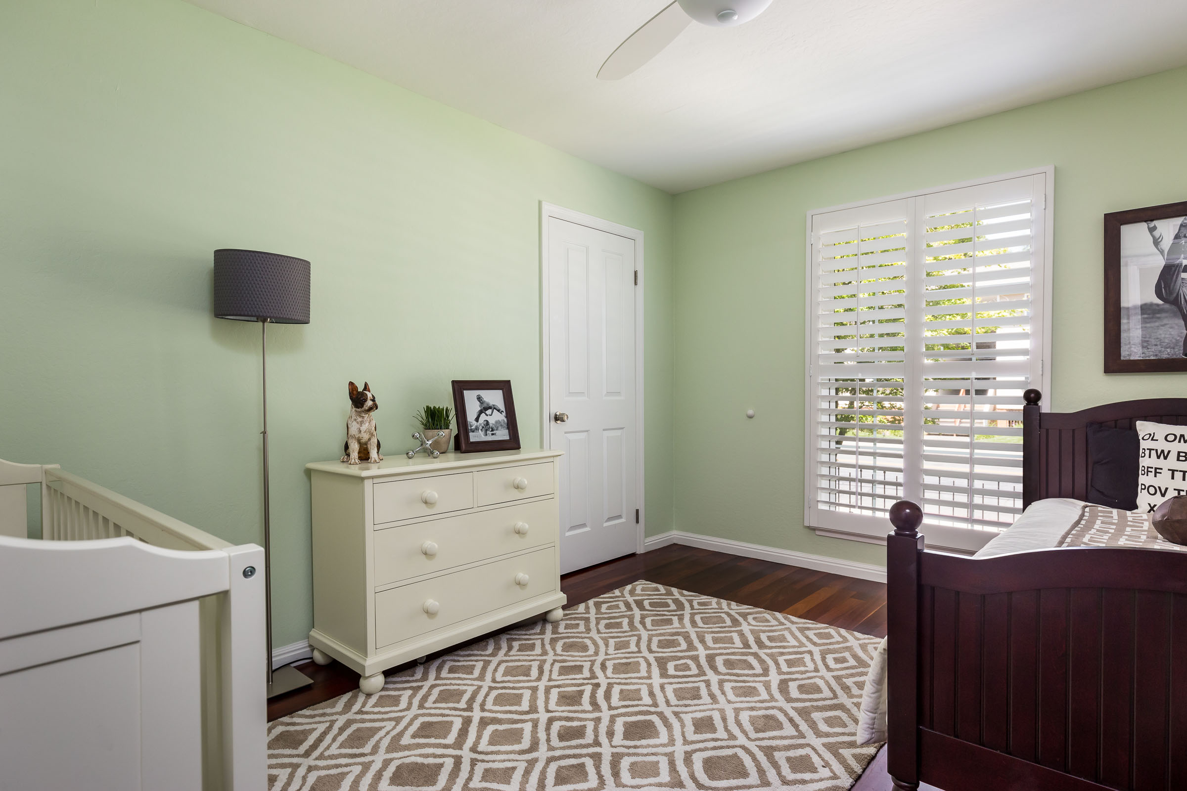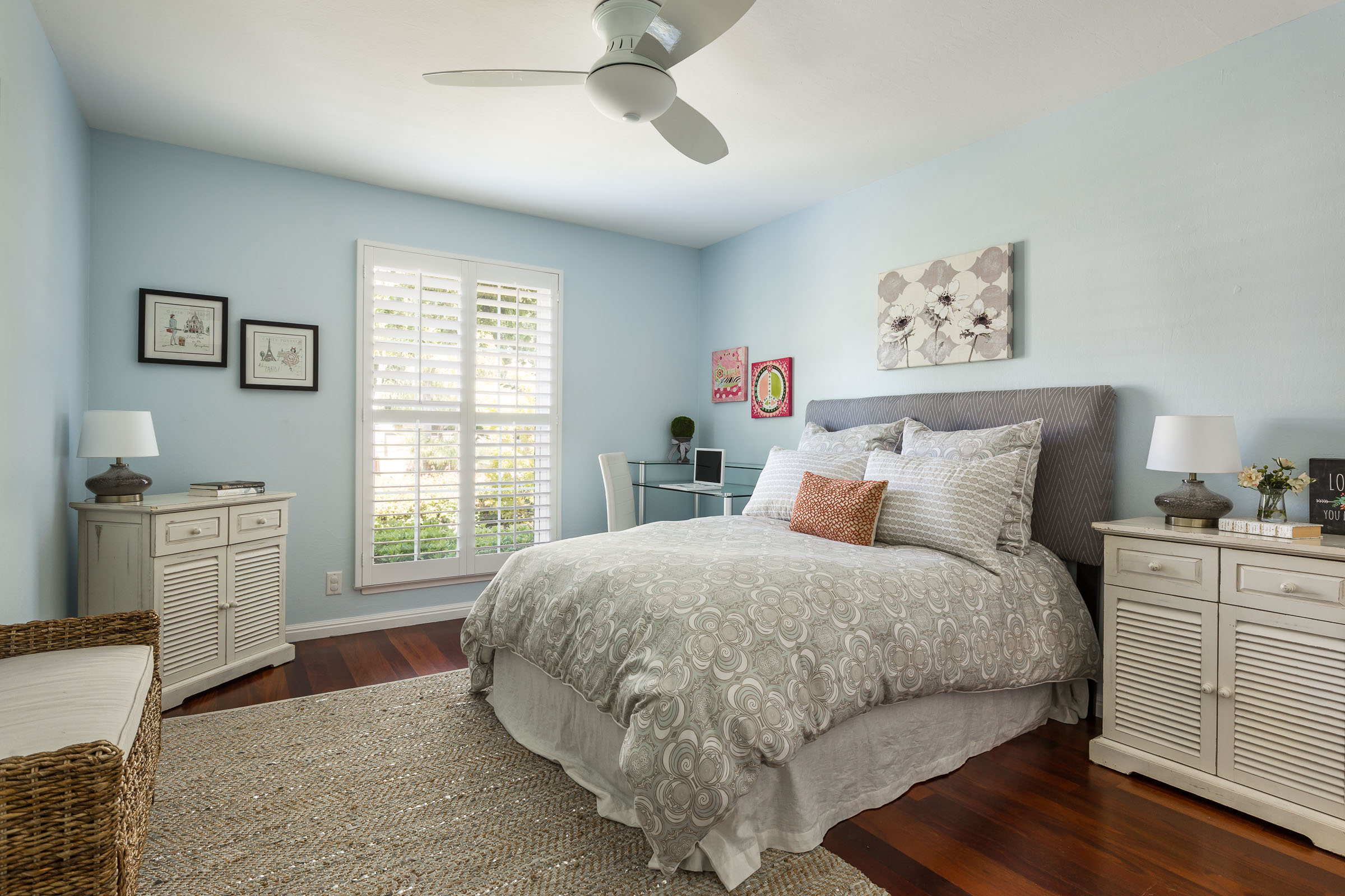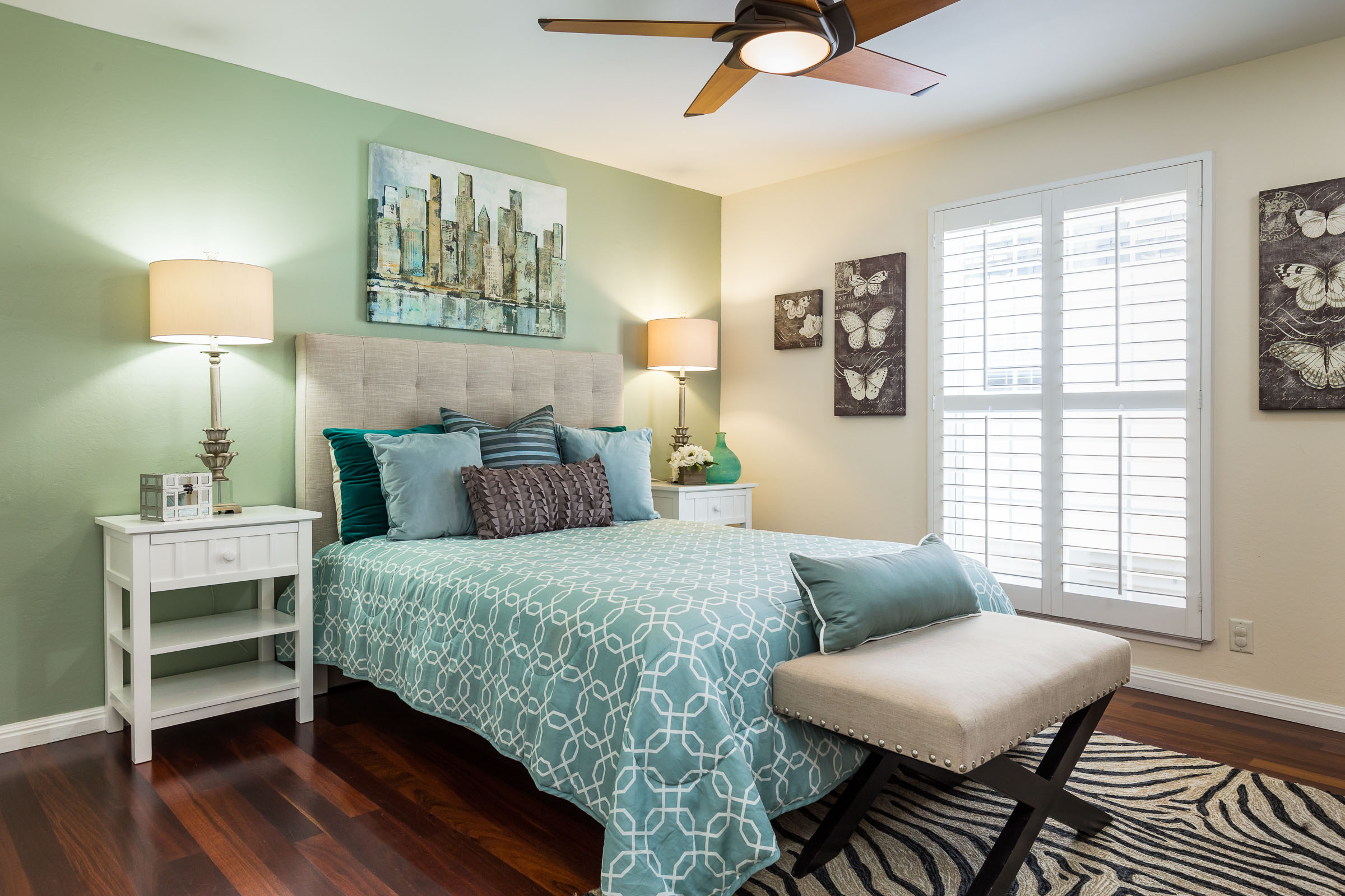 Master bedroom is generous in size with plantation shutters, ceiling fan and a refreshing custom designed bathroom.