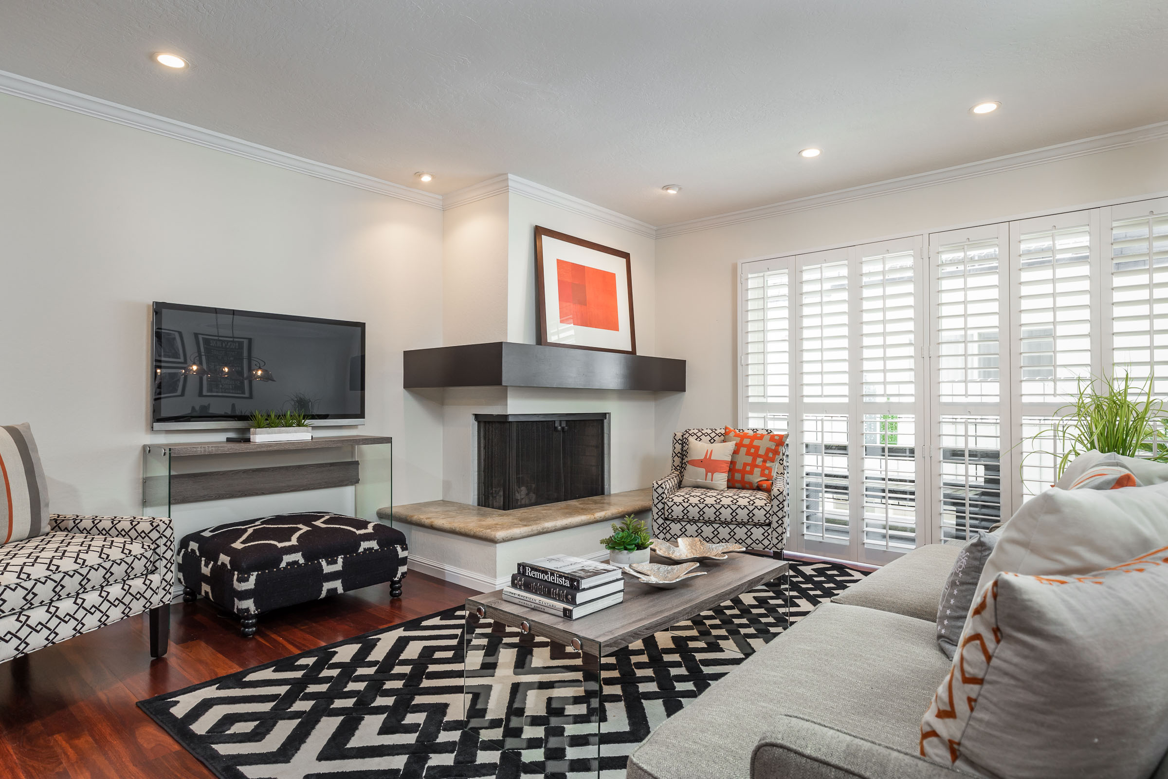 Living Room/Dining Room is a fabulous open space with a handsome hearth featuring a wood burning fireplace, beautiful hardwood floors and plantation shutters.
