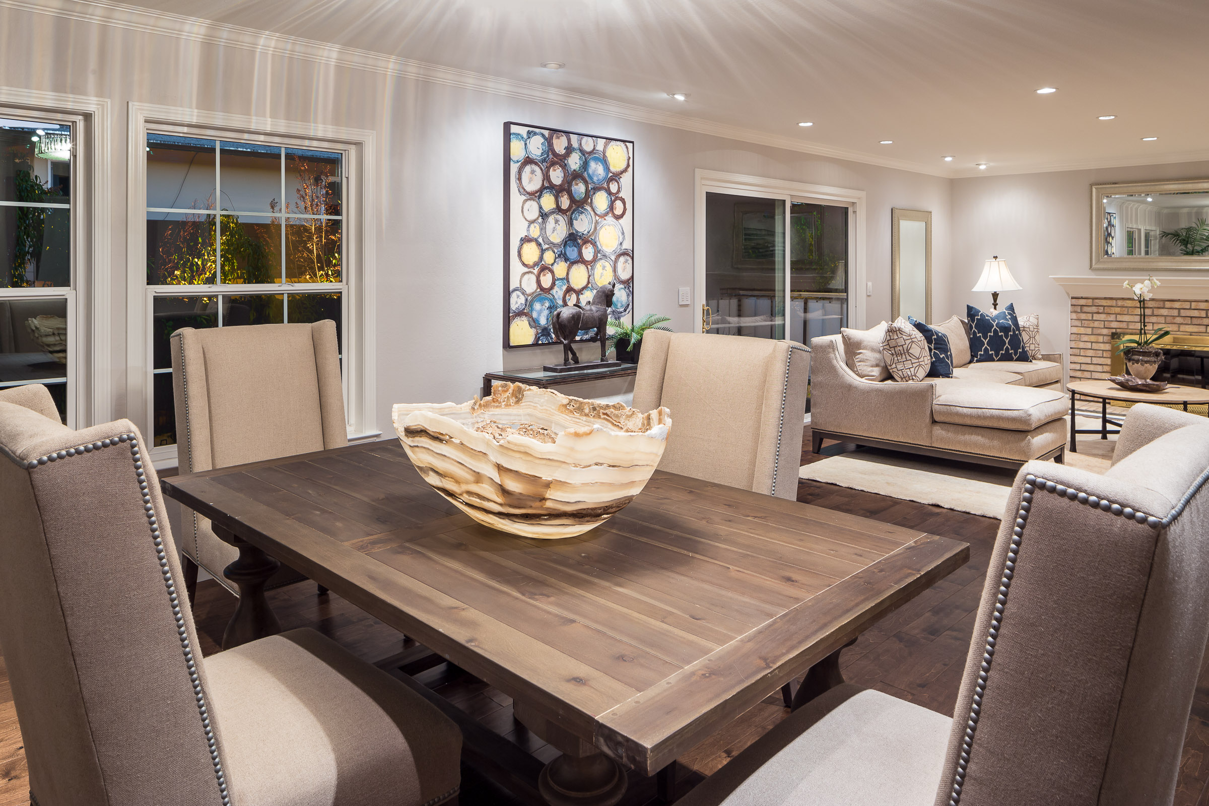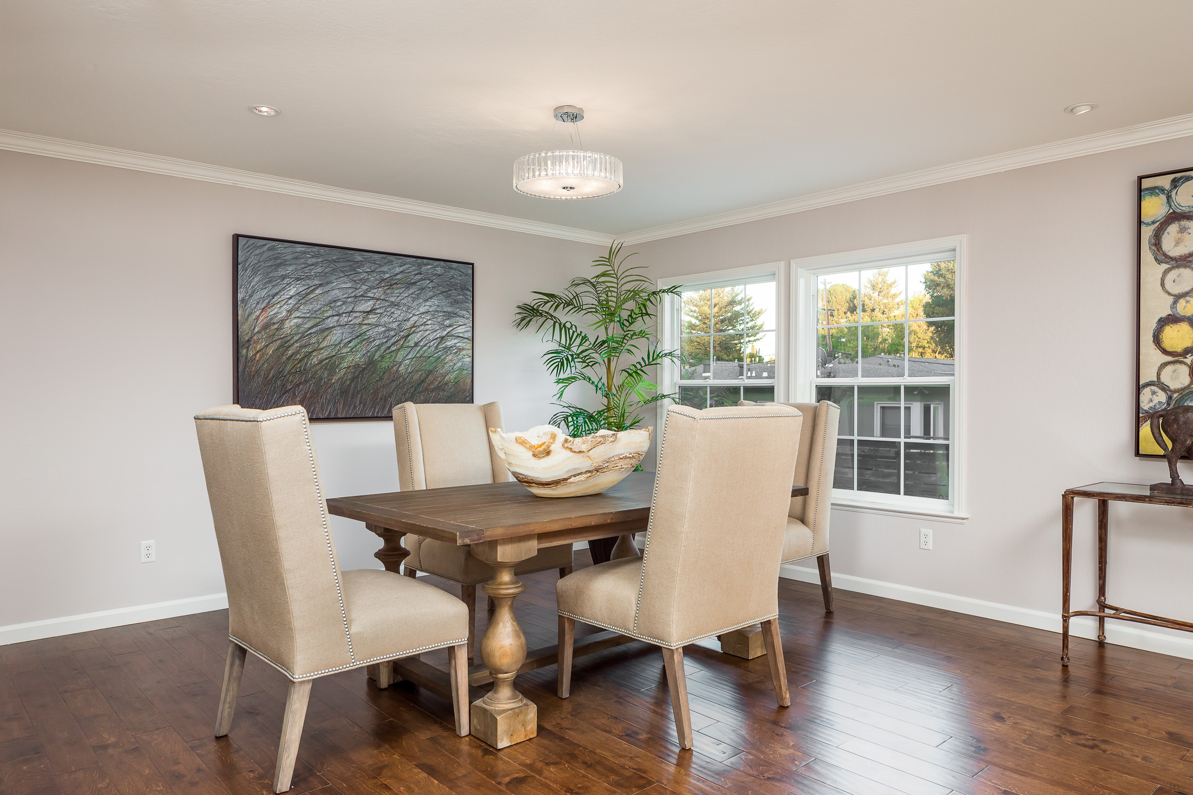 Bright and spacious living room, with adjacent dining room, boasts crown molding and recessed lighting—perfect for relaxing and entertaining.