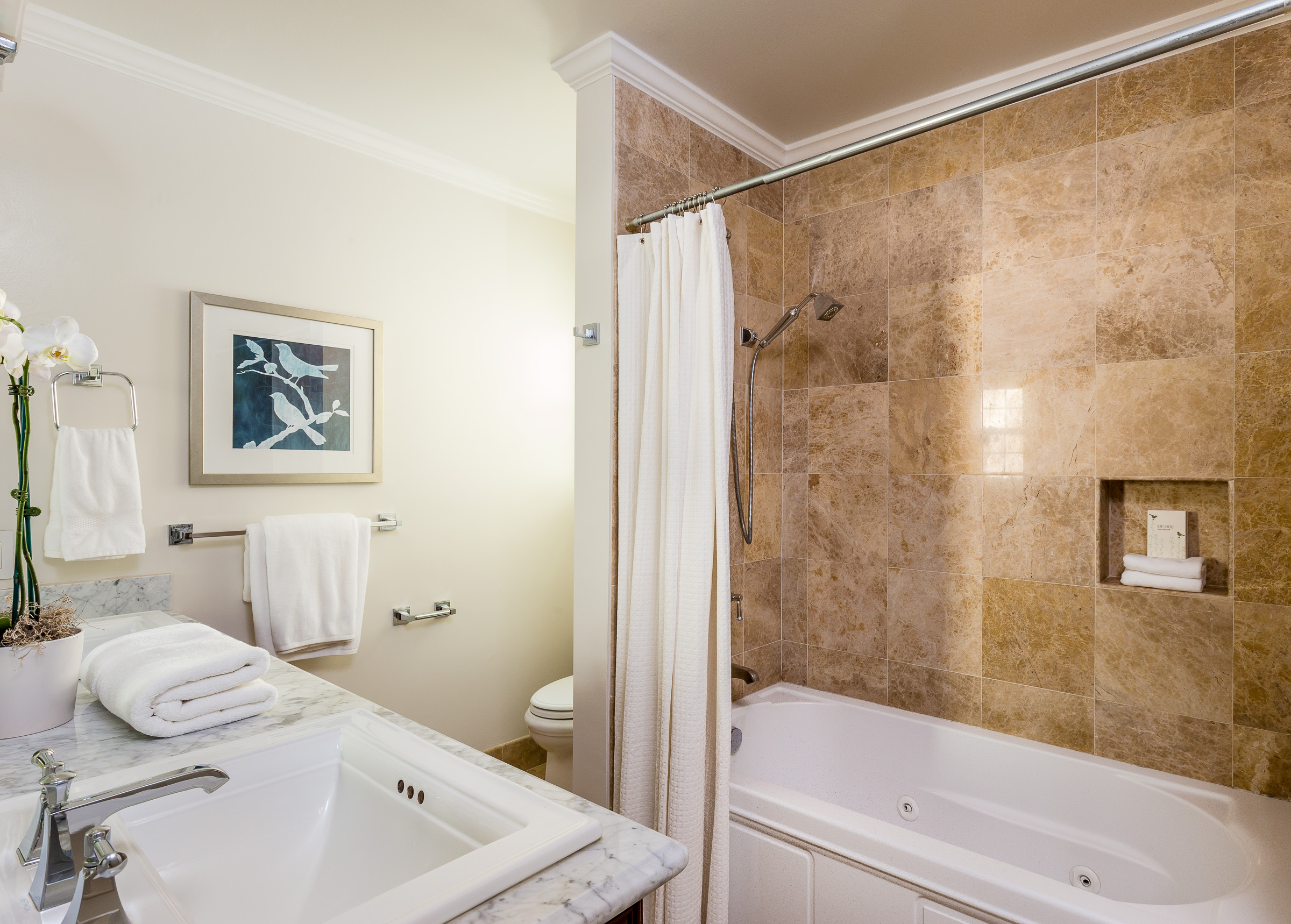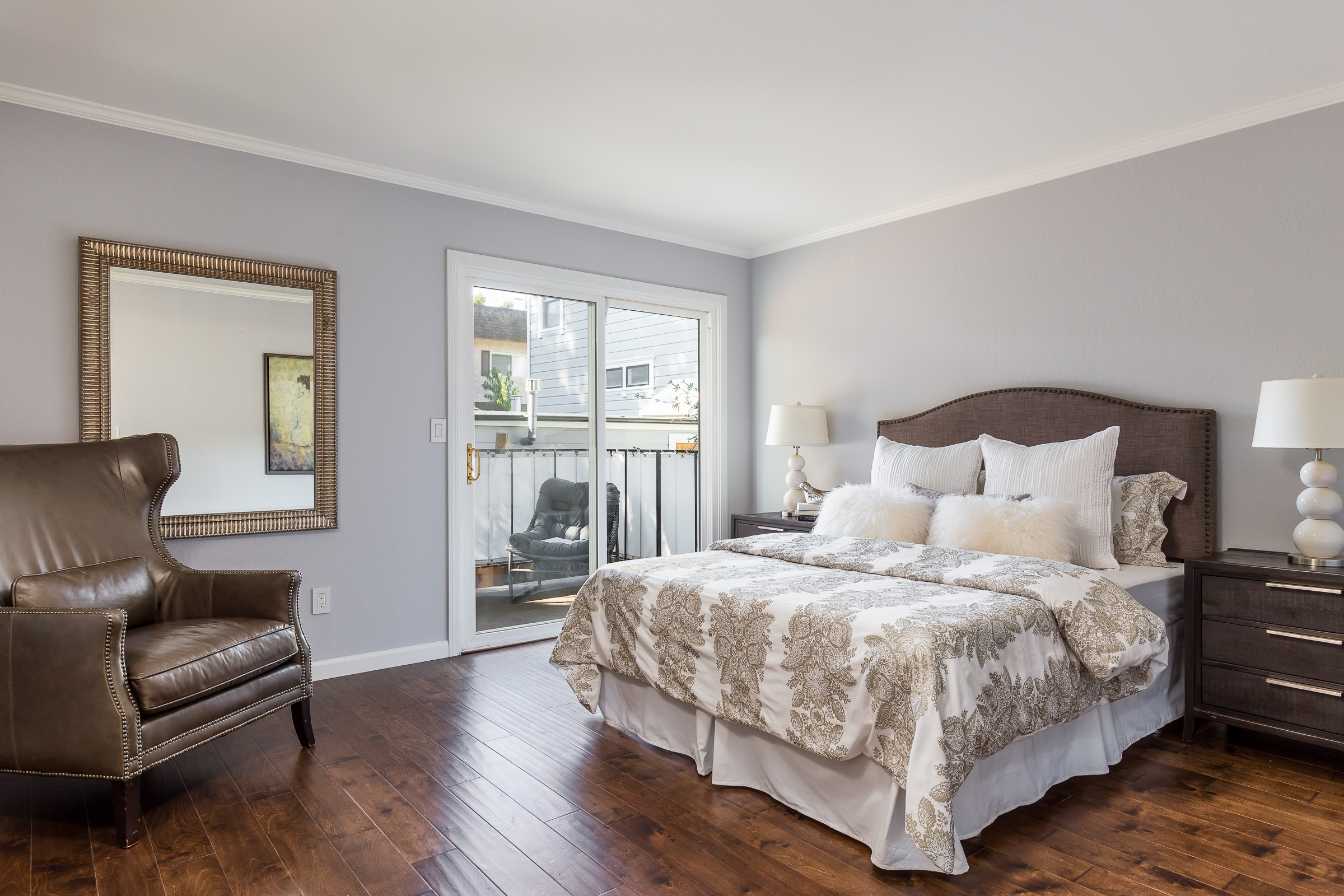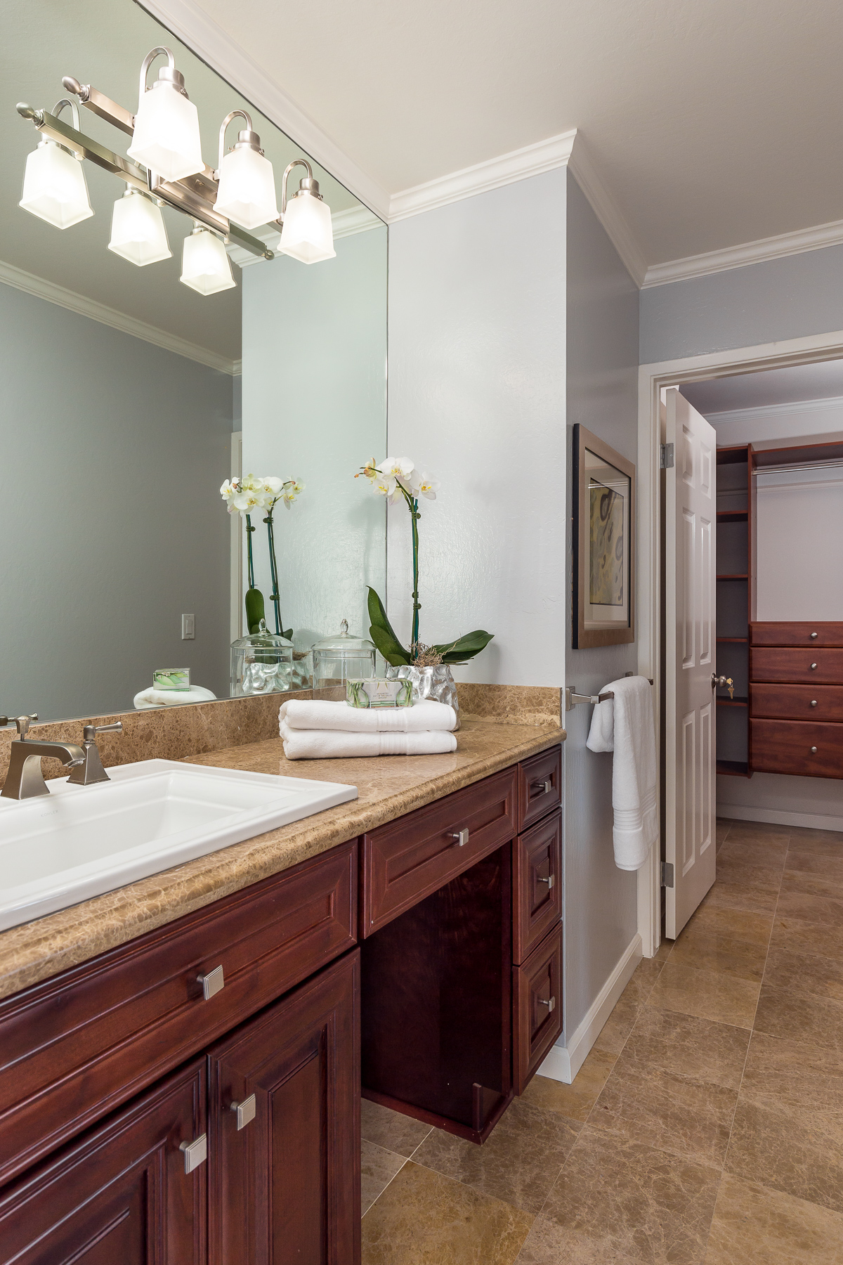 Luxurious master suite has private balcony, separate marble vanity, and large custom-designed walk-in closet.
