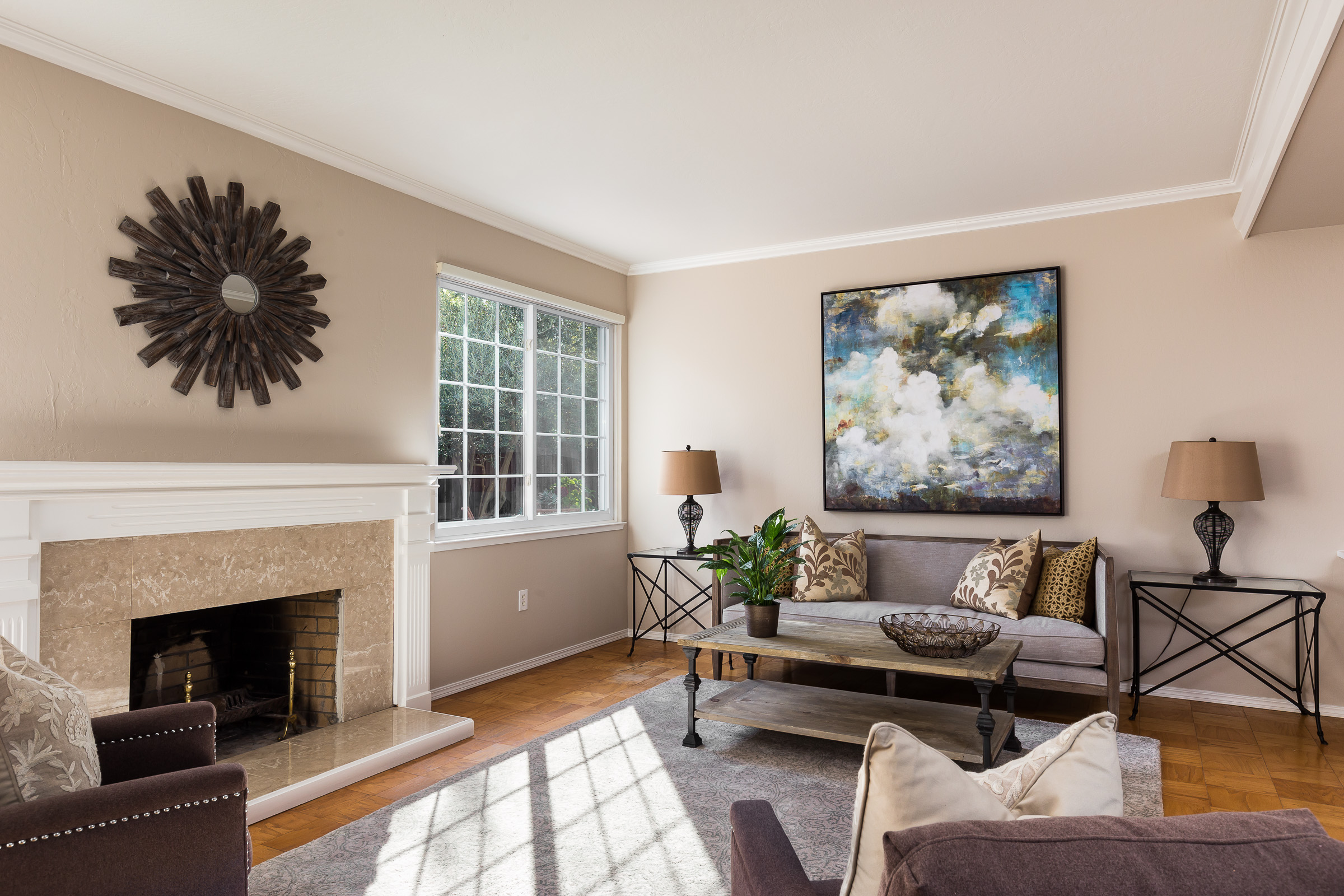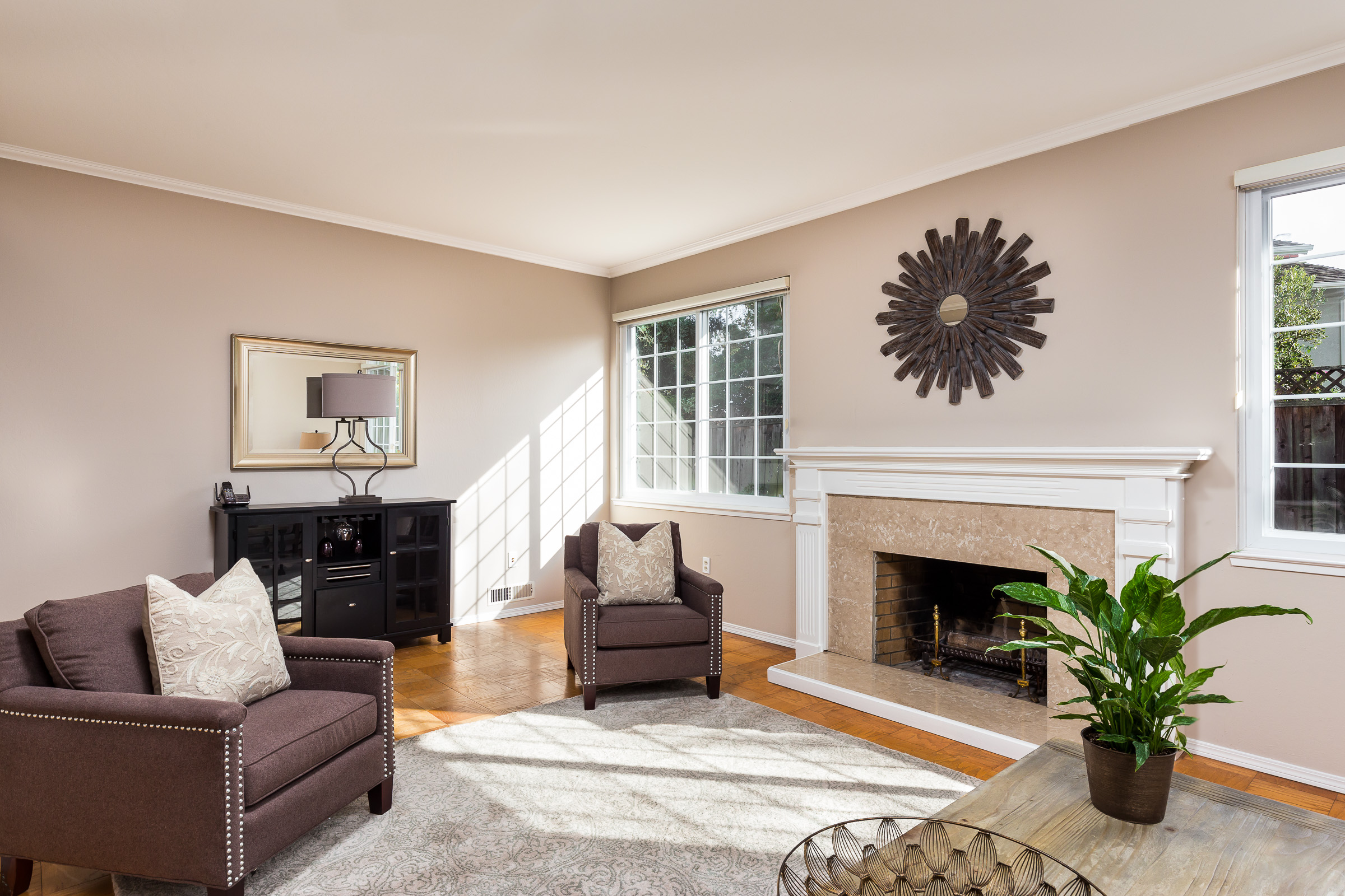 Separate formal dining room overlooks bright and spacious living room with parquet floors and a wood-burning fireplace which boasts a beautiful marble hearth.