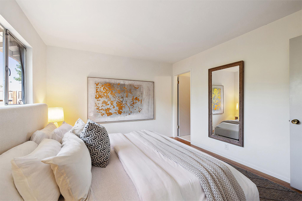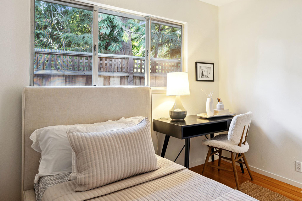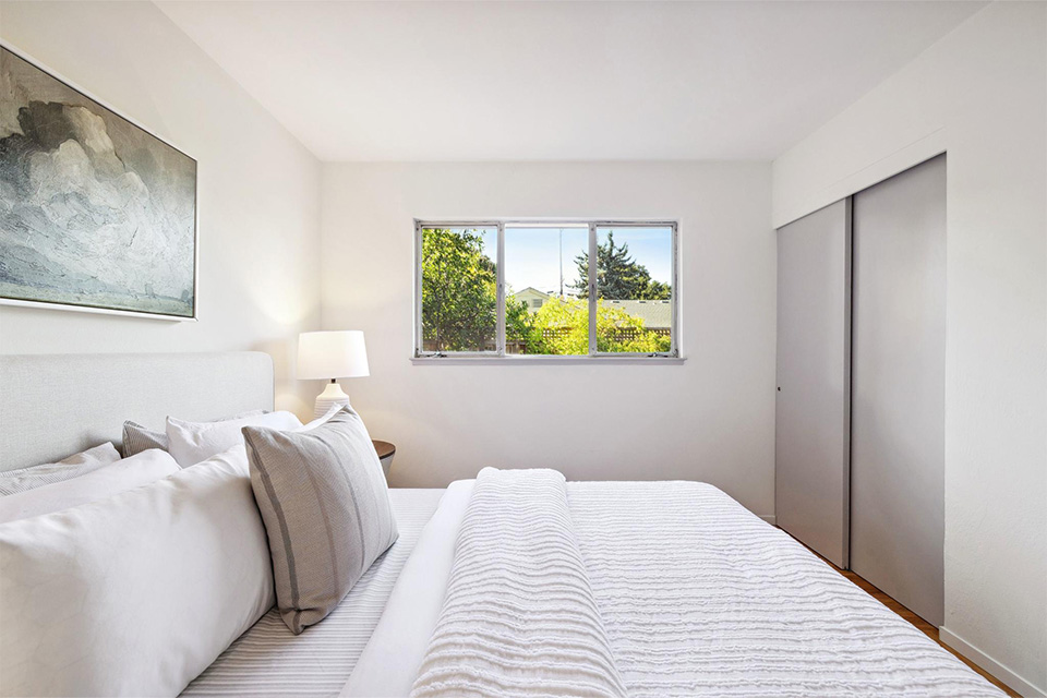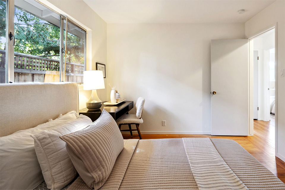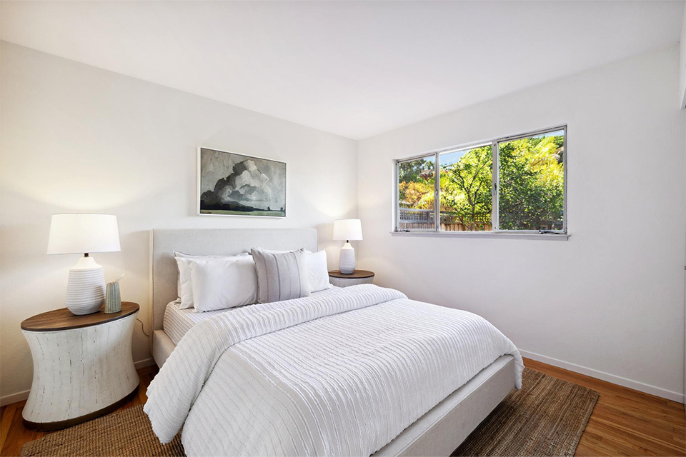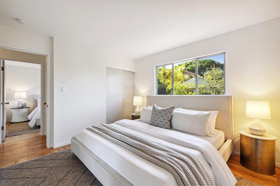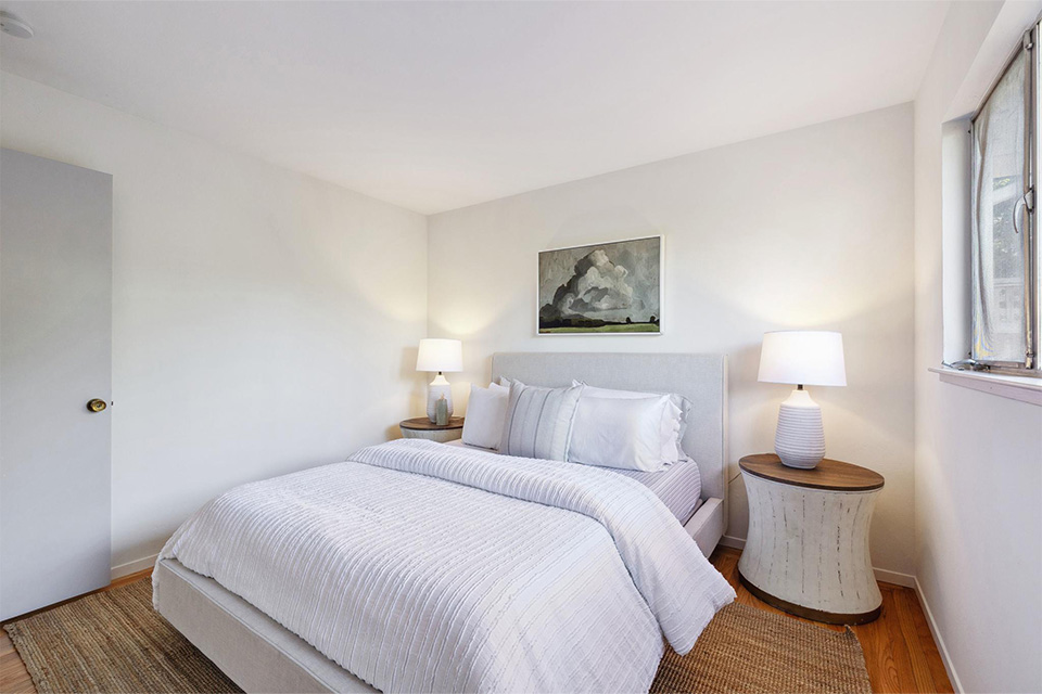 Three well-appointed bedrooms are located in the rear. Two are serviced by a remodeled hall bathroom, and the primary ensuite is situated in the rear for privacy.