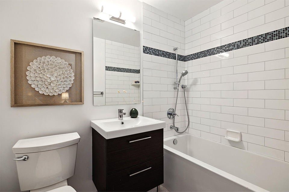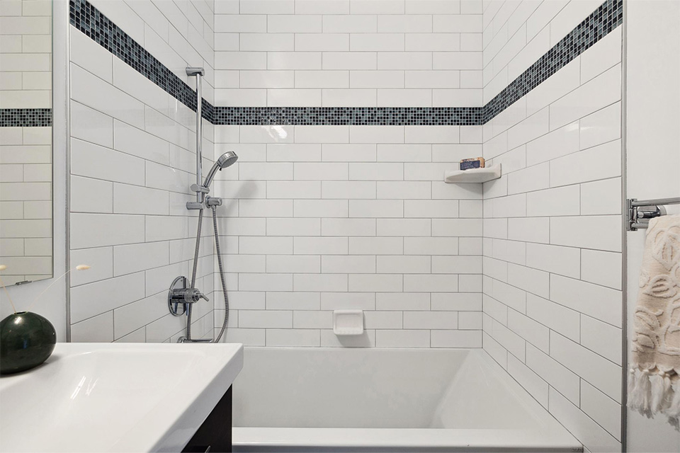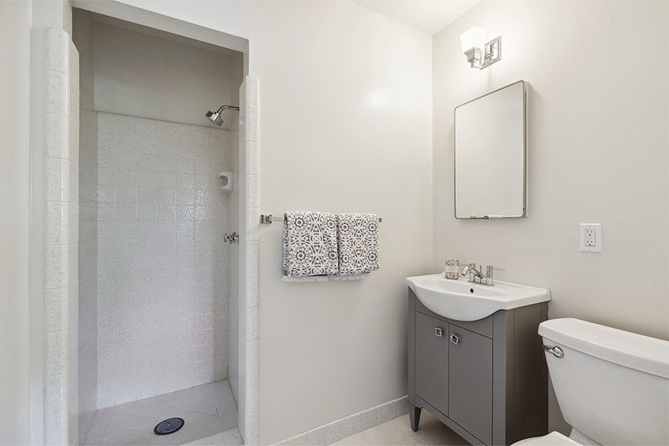 - Remodeled hall bathroom with shower over tub and modern vanity.