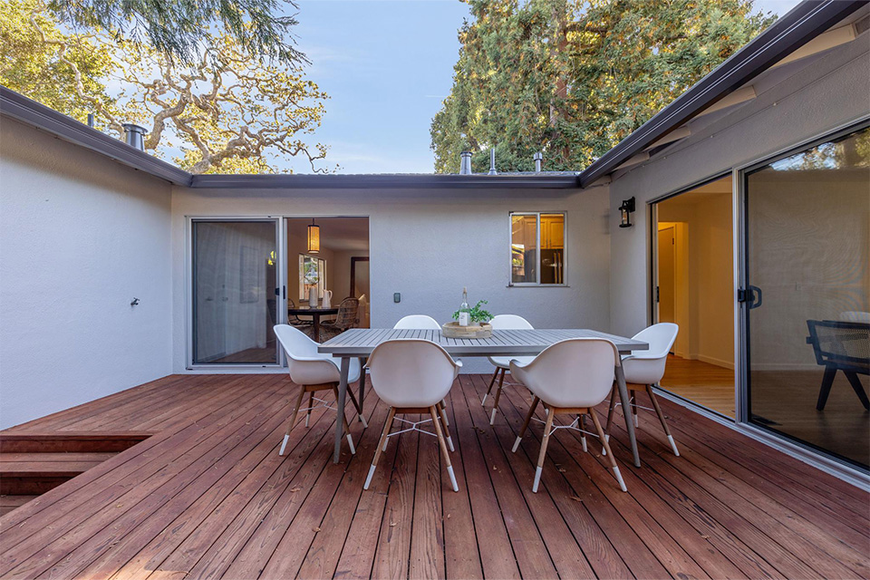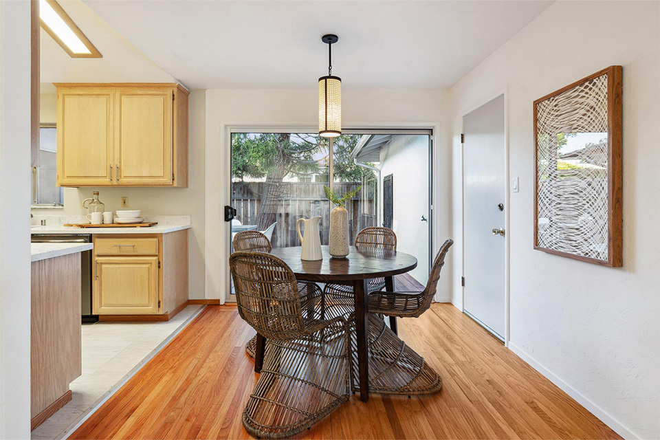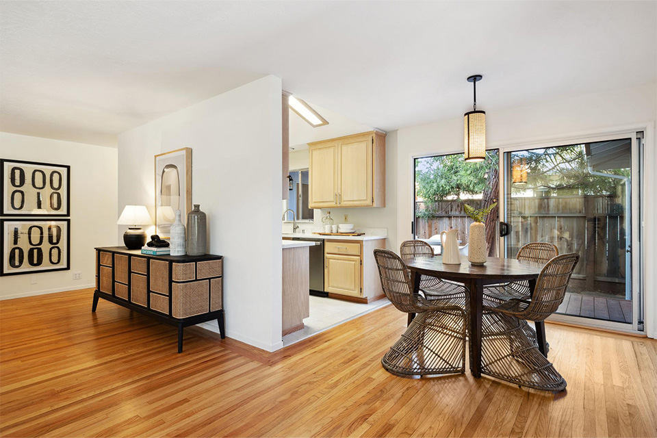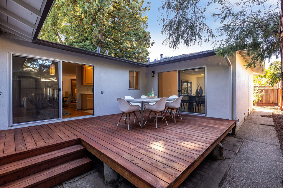 The large family room, with a dining area and sliding doors accessing the redwood deck and rear yard, is a fabulous space for enjoying family time, holidays, birthdays, and gatherings with extended family and friends.