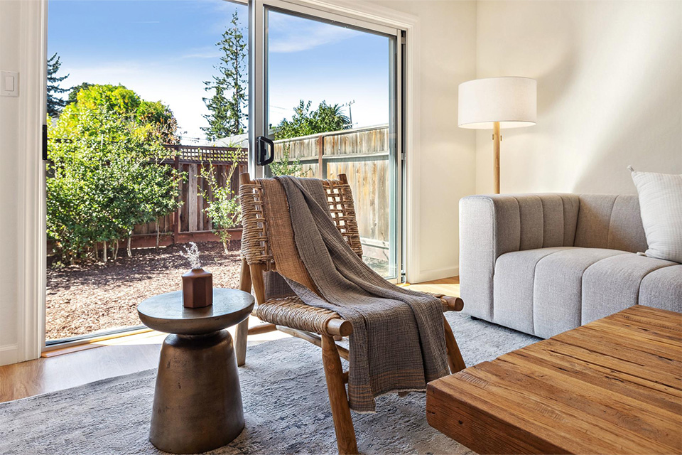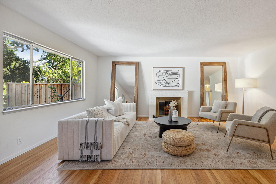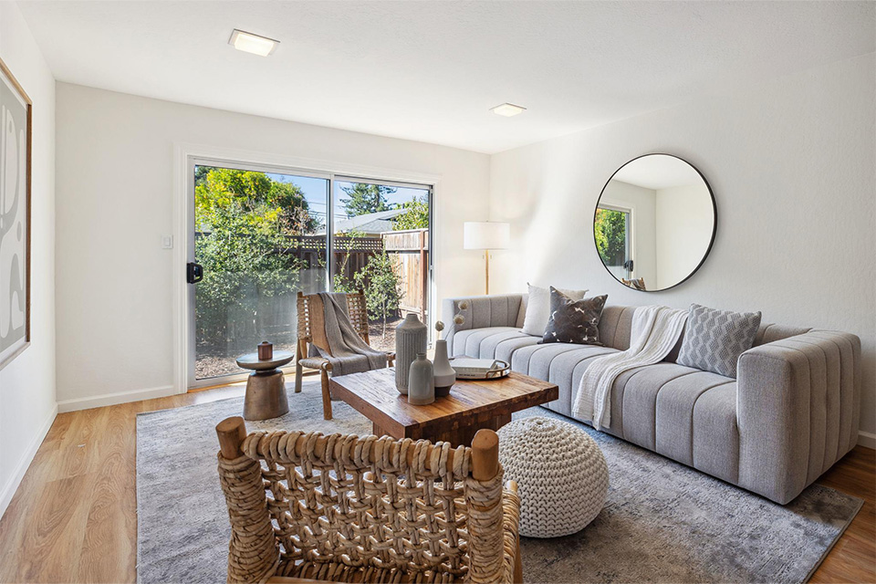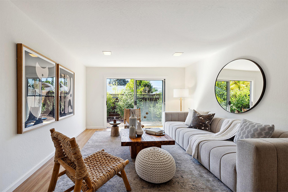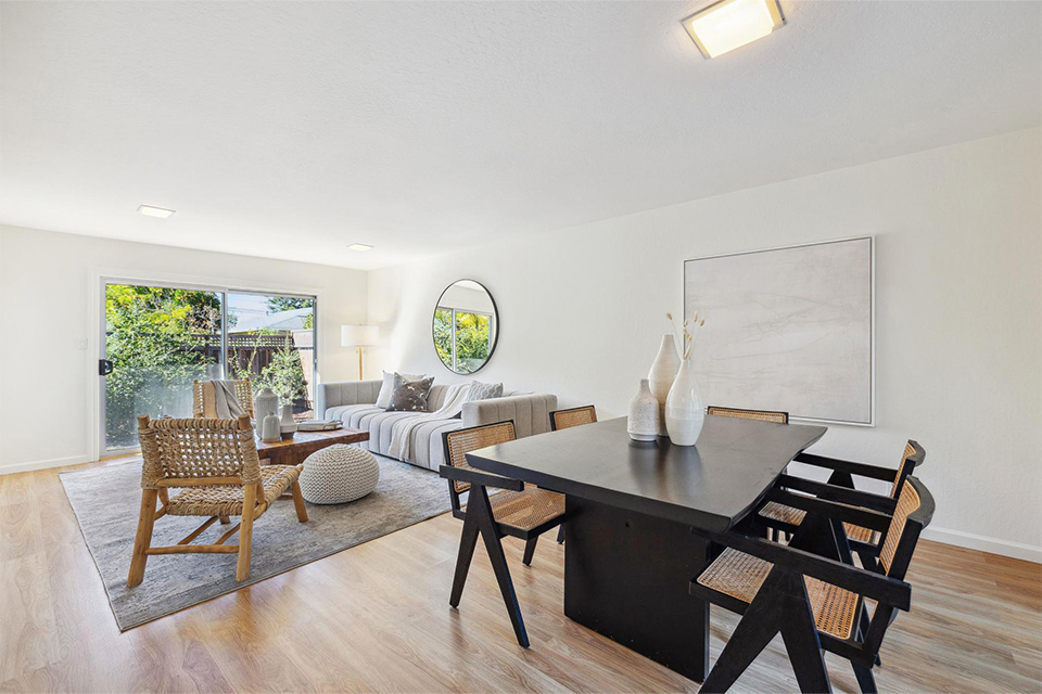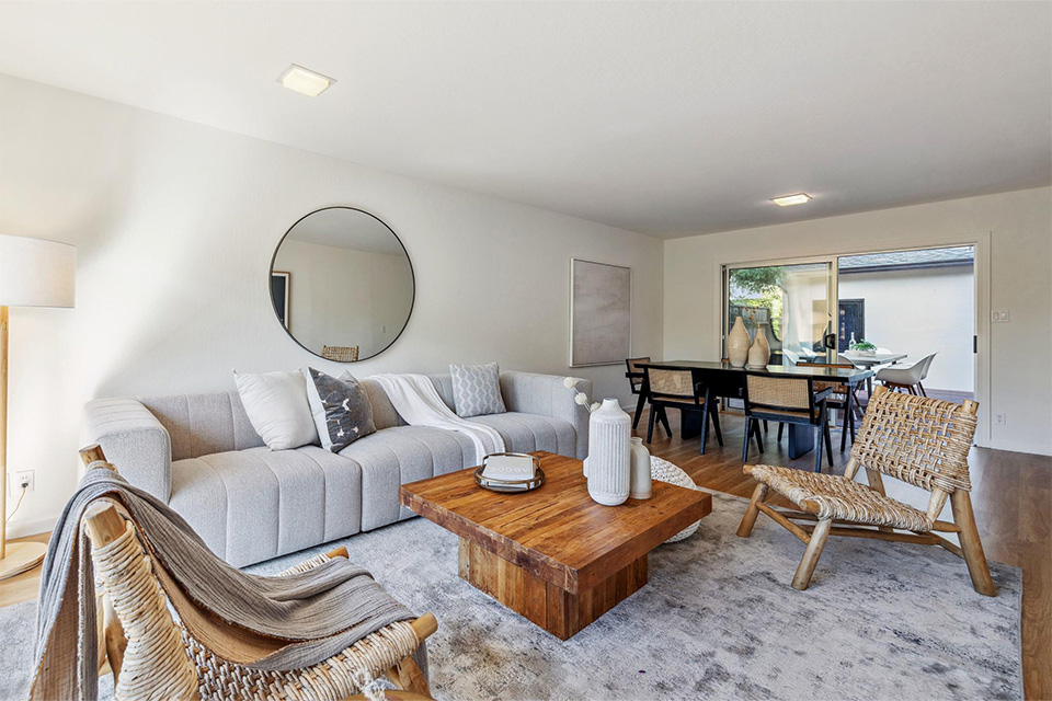 - Bright living room with adjacent dining area.