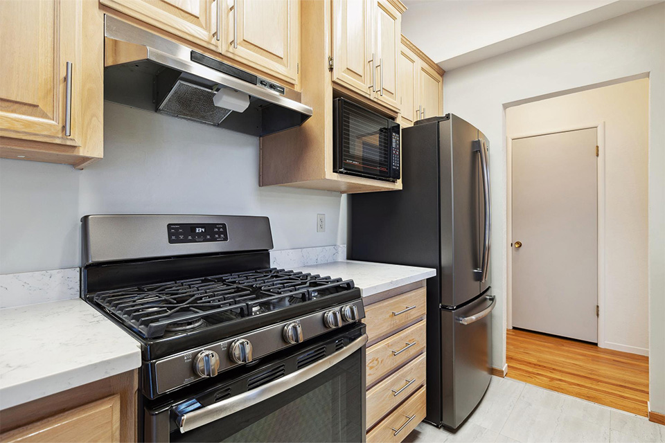 - New kitchen appliances, July 2019: Refrigerator, dishwasher, oven/stove, fan/hood.