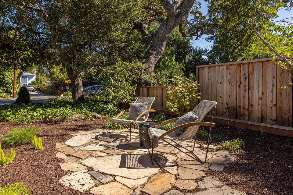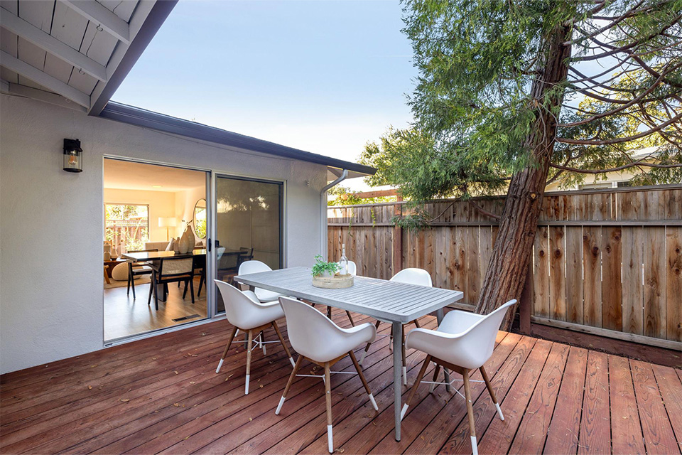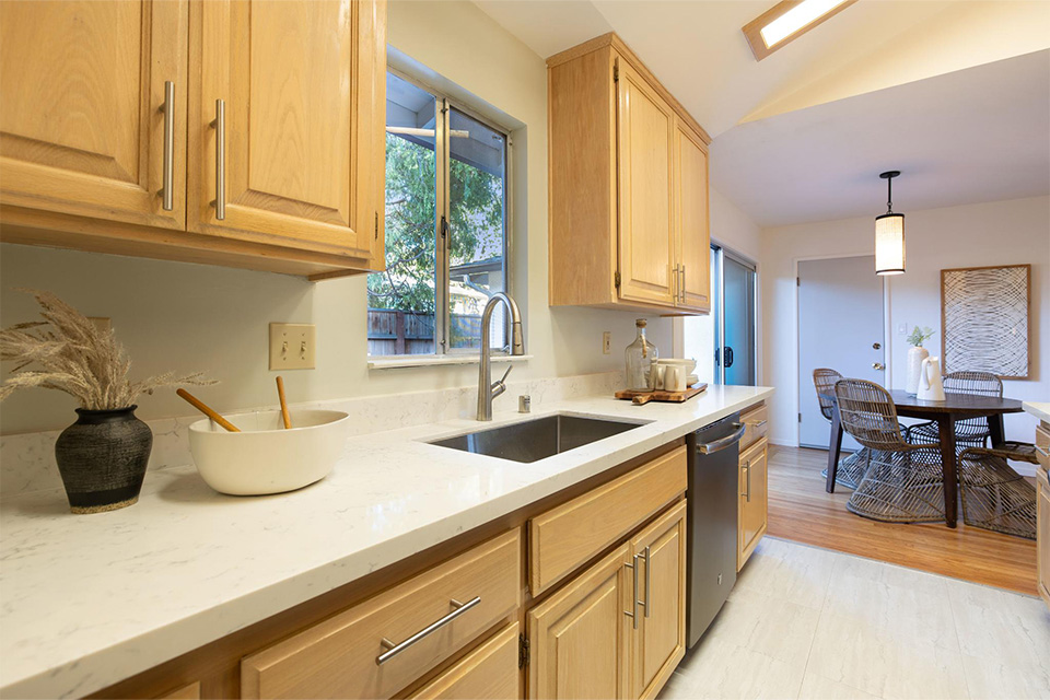 The remodeled kitchen, with stainless steel appliances and a soothing color scheme, looks out onto a beautiful redwood deck and Cedar tree. Sliding doors from the dining area lead out to the deck for easy entertaining, socializing, and al fresco dining under the stars and the gorgeous surrounding trees.