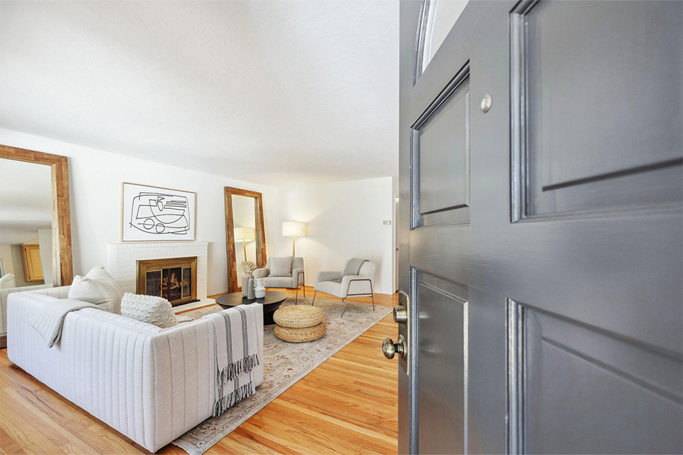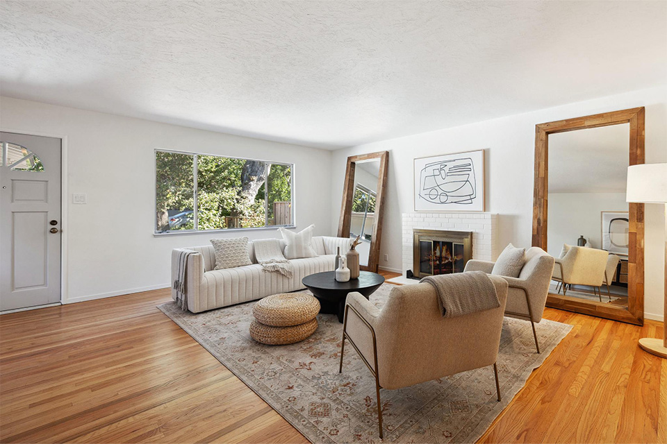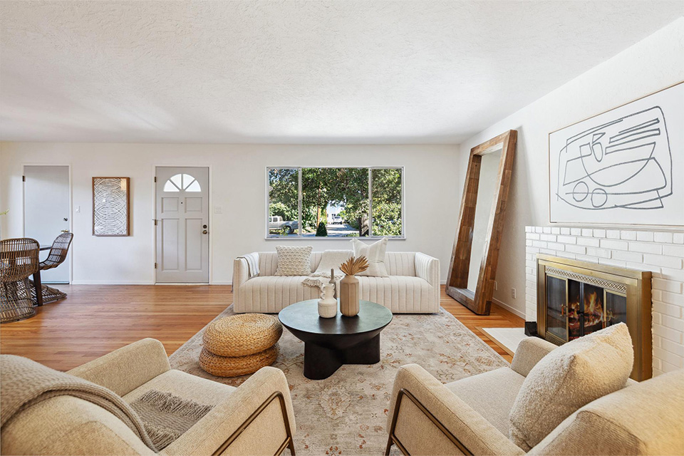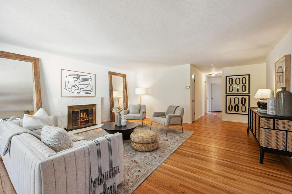 This well-loved home has a great feel and lends itself well to socializing, entertaining, and enjoying day-to-day life as a family, such as Sunday family dinners, barbeques for friends and extended family, holidays, and birthdays. The living room is bright and welcoming, with beautifully refinished hardwood flooring, a fireplace, and a large window overlooking the front yard and spectacular oak trees.