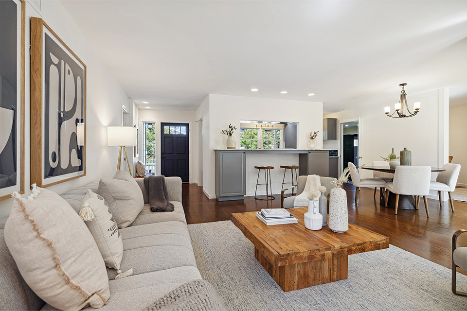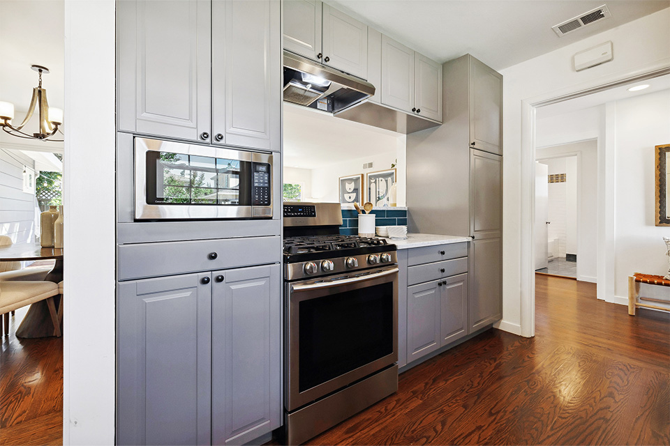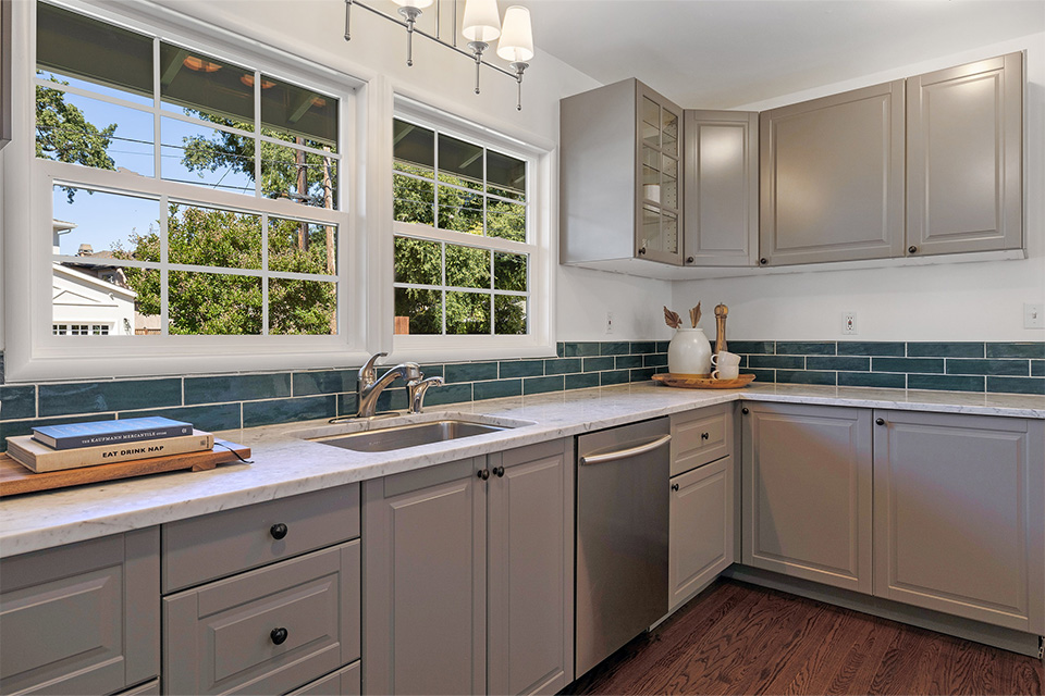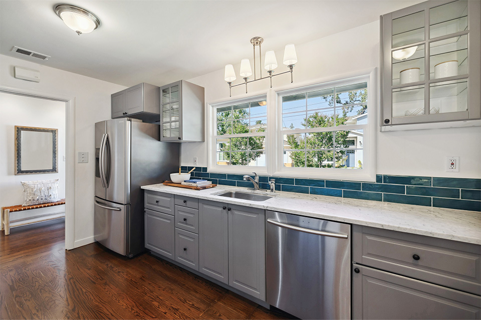 The kitchen features Carrera marble countertops that pair beautifully with grey custom cabinets and stainless steel appliances, including a gas range. Dual pained windows look out onto the front yard, and the kitchen opens to the living room with a countertop bar which allows for a smooth connection to the living room and dining area.