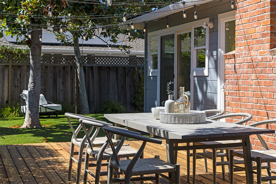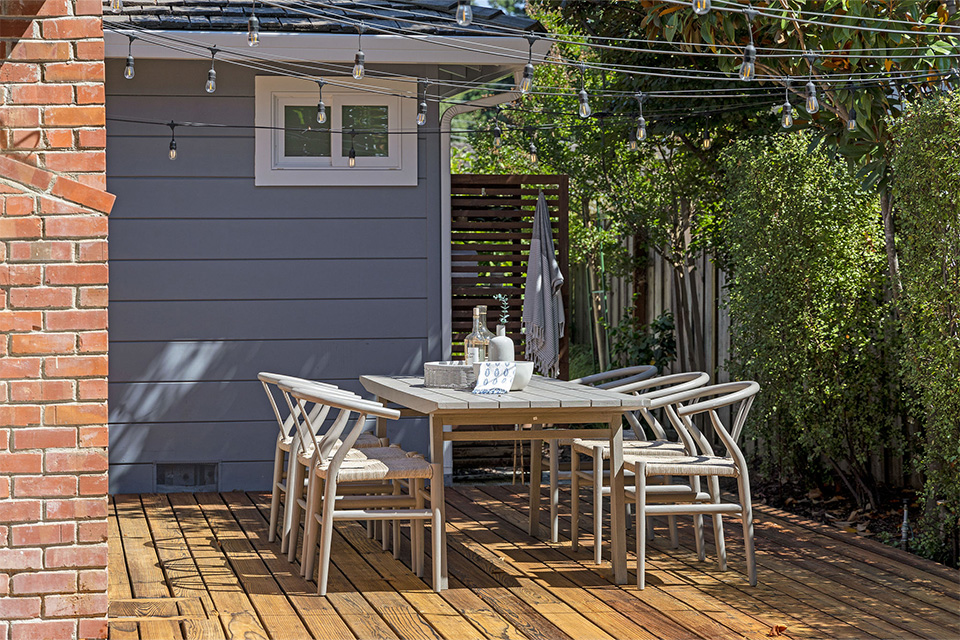 The living room has a gas starter fireplace with windows on either side. A sliding glass door leads to an expansive redwood deck with a natural gas line perfectly planned to accommodate family BBQ nights or entertaining large dinner parties. Cafe lights are hung with care and quality installation, adding charm and ambiance.