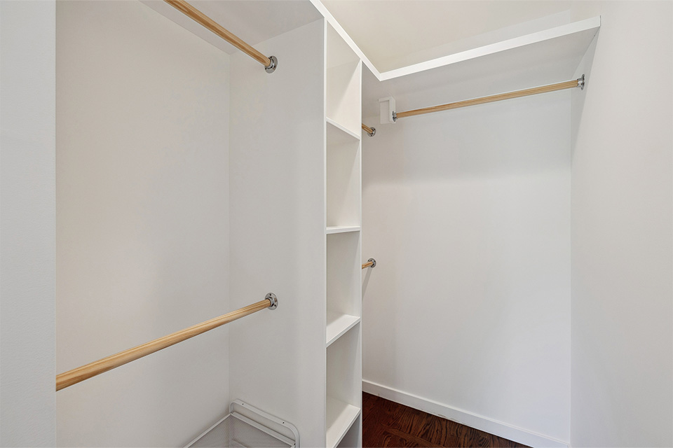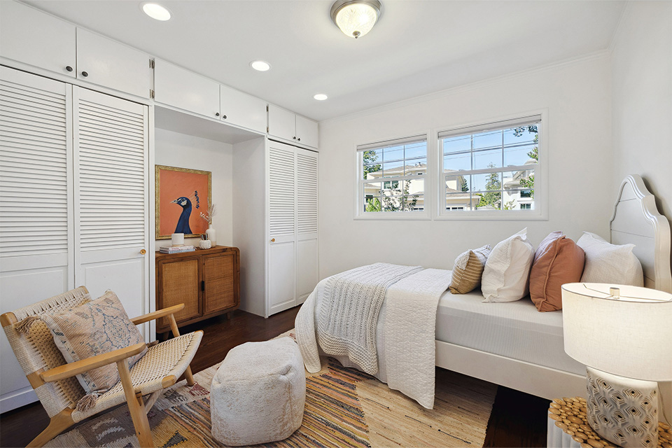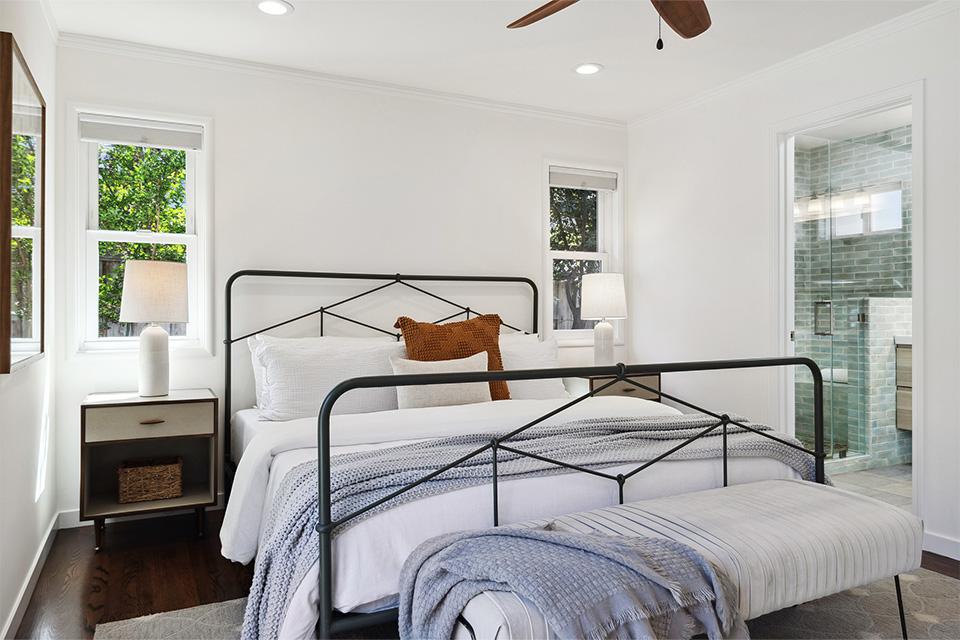 The primary suite is flooded with natural light and has its own private patio with lush landscaping, including a tulip magnolia tree, making it a perfect place to enjoy a cup of tea and a good book. The primary bathroom has a calming vibe with a gorgeous walk-in shower and two types of shower heads. A large vanity features dual sinks and plenty of storage.