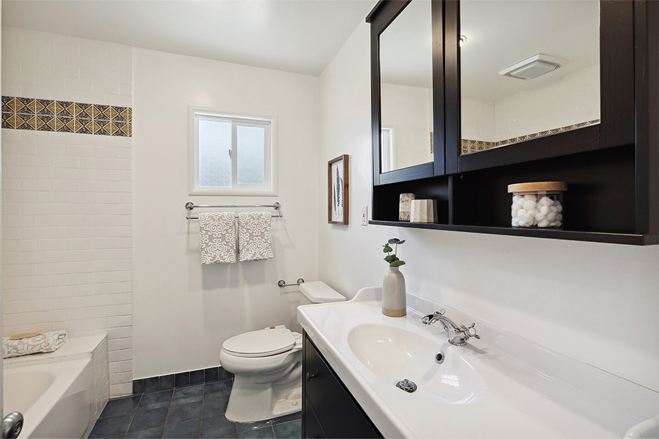 Two additional bright bedrooms share a hall bathroom with a shower over a tub featuring custom blue tiles, a large handsome sink, and a vanity.
