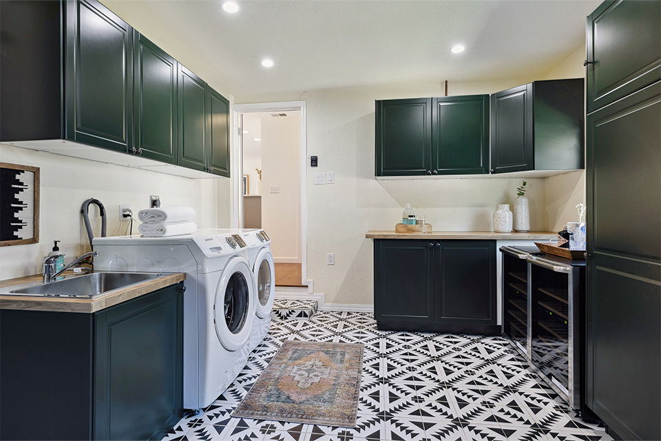 A fun decorative laundry area just off the kitchen is equipped with custom cabinets, generous counter space, and two wine fridges (yes, they are included!)