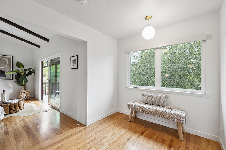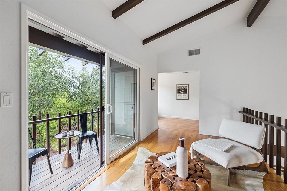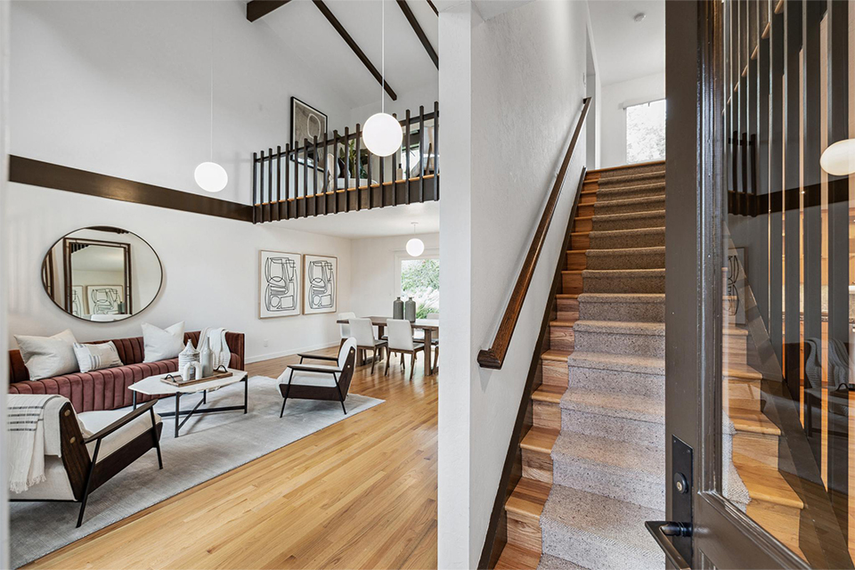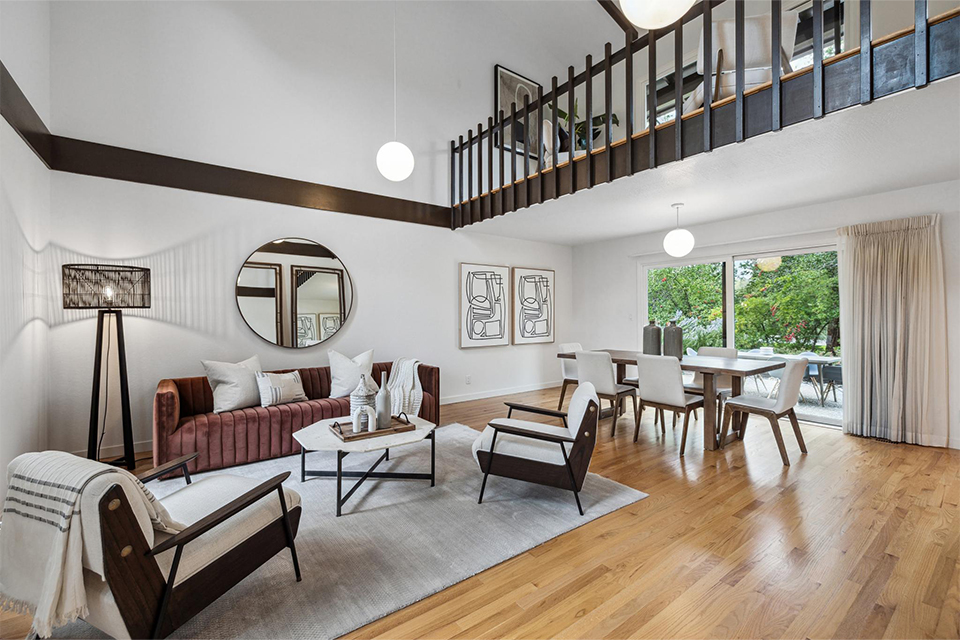 The midcentury modern feel of the house has been preserved with round hanging light fixtures and Japanese-inspired interior railings. The loft sitting room or office space overlooks the living room.
