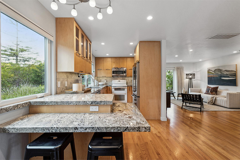 The beautifully custom-designed kitchen is a cook’s delight with gorgeous granite countertops, a breakfast bar, and a unique marble backsplash.