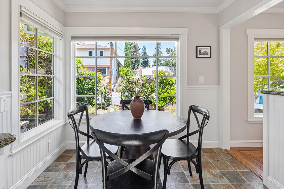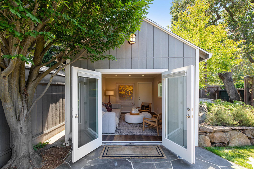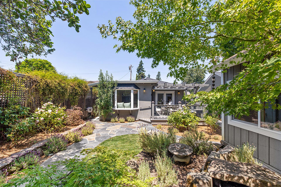Experience downtown living at its best! This charming, updated bungalow is the perfect place to call home, ideally just one block from the heart of downtown Menlo Park. It is beautifully updated and well-maintained, with a sophisticated style and hardwood flooring. The focal point of the living/dining room is a gas fireplace with a gorgeous stone hearth. The kitchen has newer stainless steel appliances, granite countertops, and a breakfast nook overlooking the privately landscaped front yard. The primary suite features a bay window overlooking the back patio with a water feature and a handsome mature oak tree. The primary bathroom, with dual sinks and a separate shower and soaking tub, boasts a large walk-in custom closet. The second bedroom also has a custom walk-in closet. Both bedrooms have French doors leading to the back deck and pergola. The garage is a finished bonus space with recessed lighting and an additional large storage room with a pull-down ladder for attic storage.