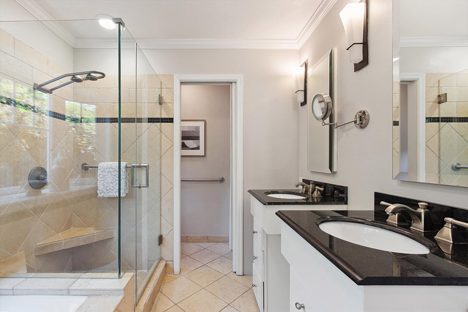 - Two spacious bedrooms with walk-in custom closets and French Doors that lead to the rear deck