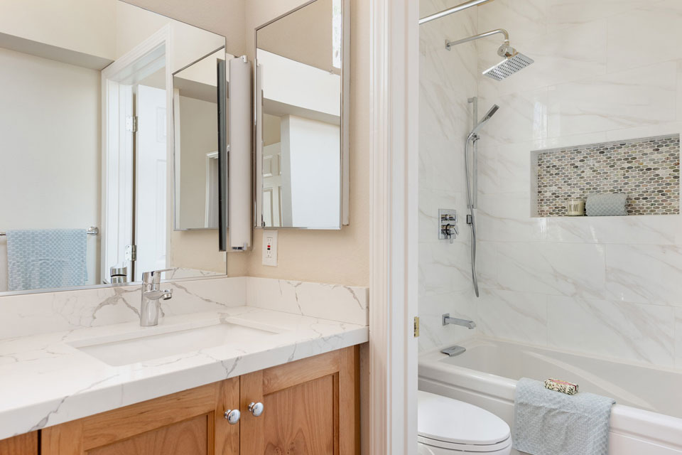 - Second bathroom with stall shower, sink/vanity, extra storage, and low flow toilet