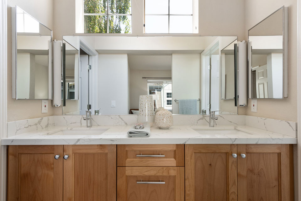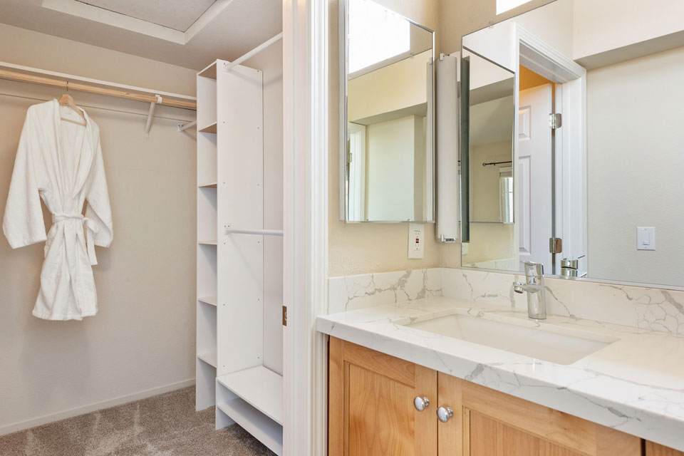 The spectacular master suite boasts vaulted ceilings and a beautifully remodeled bathroom with new countertops, vanity, flooring, tub, shower, and spa-like fixtures.