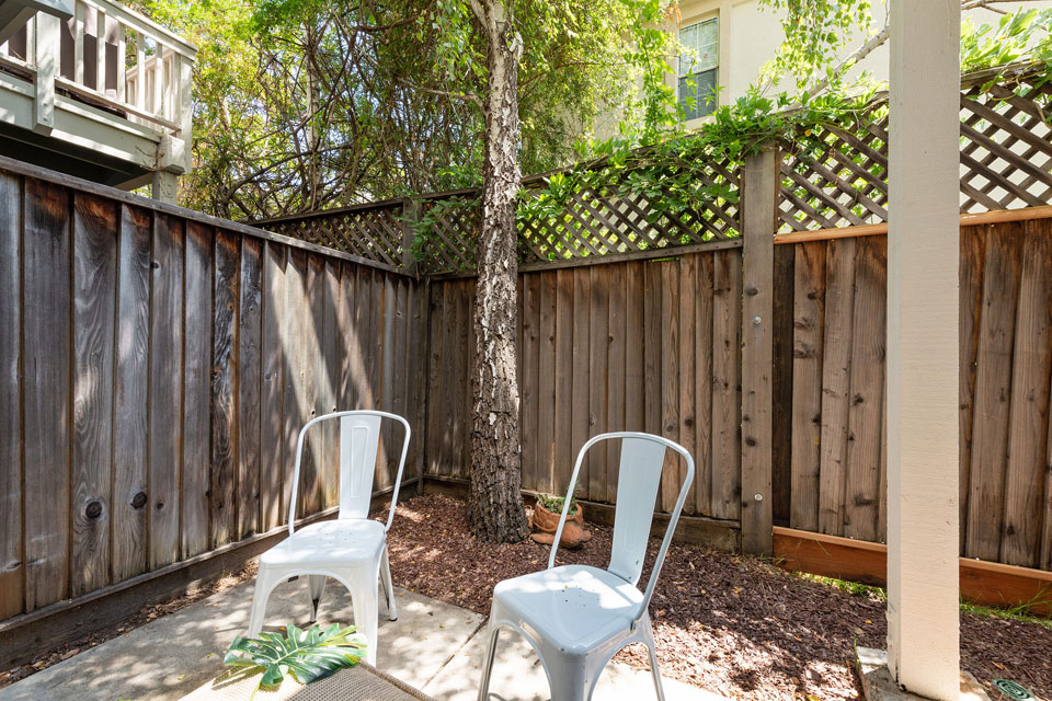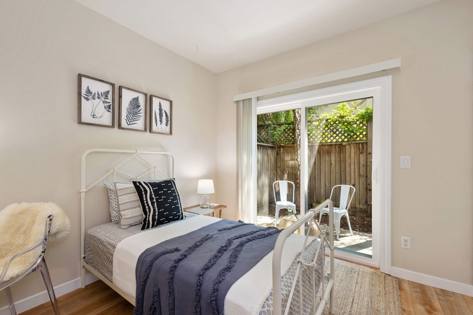 On the lower level, the second bedroom is ideal for guests or a home office with a lovely outdoor patio area.