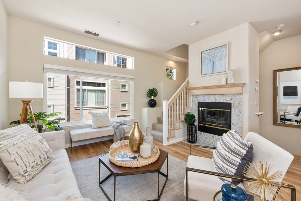 The living room is filled with natural light, high ceilings, and a cozy fireplace. The adjacent dining area and open kitchen with beautiful granite counters and bar seating make this area the heart of the home for easy entertaining and relaxing.