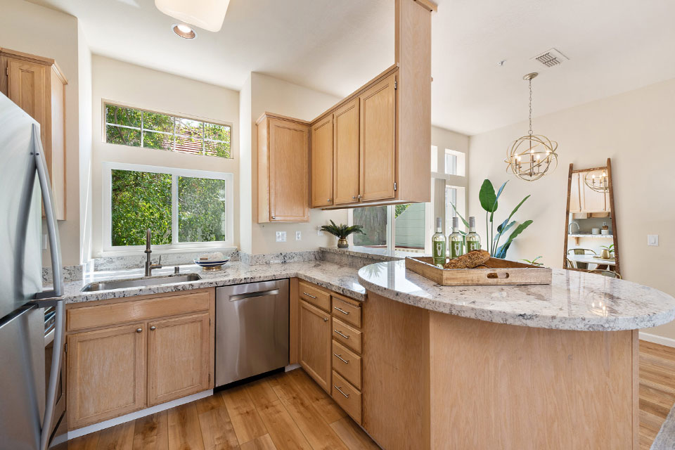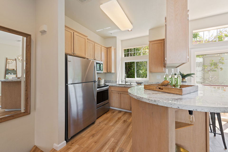 - Open kitchen with granite countertops, bar seating & stainless steel appliances